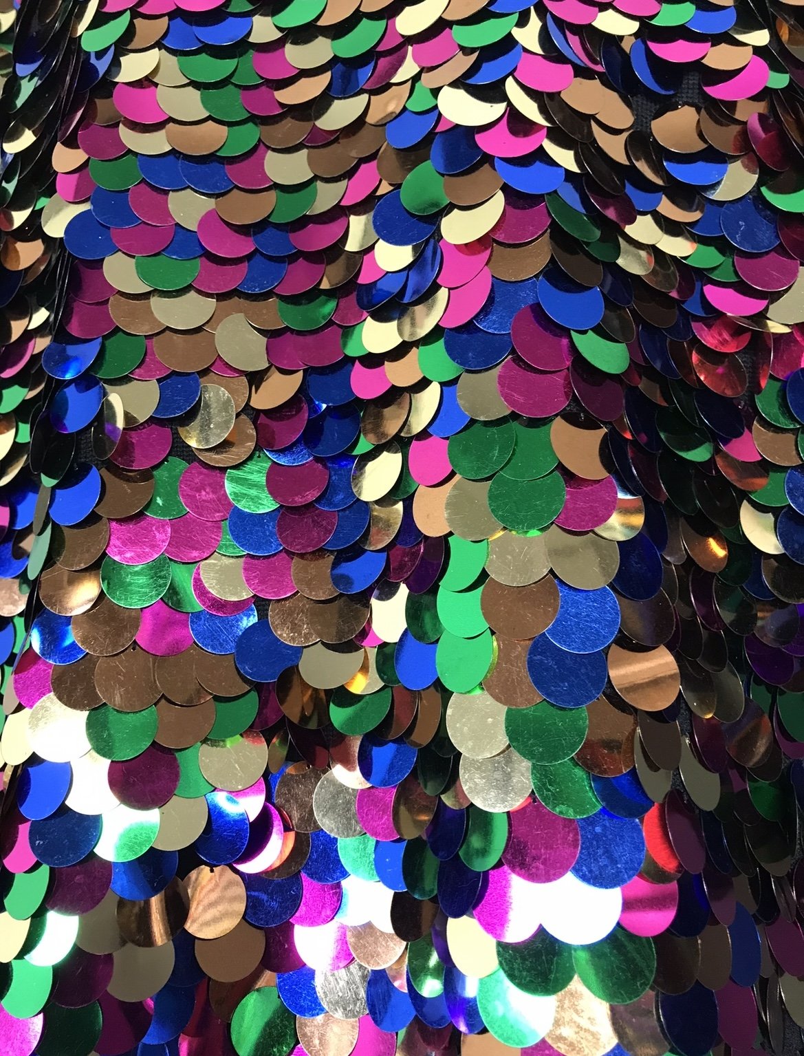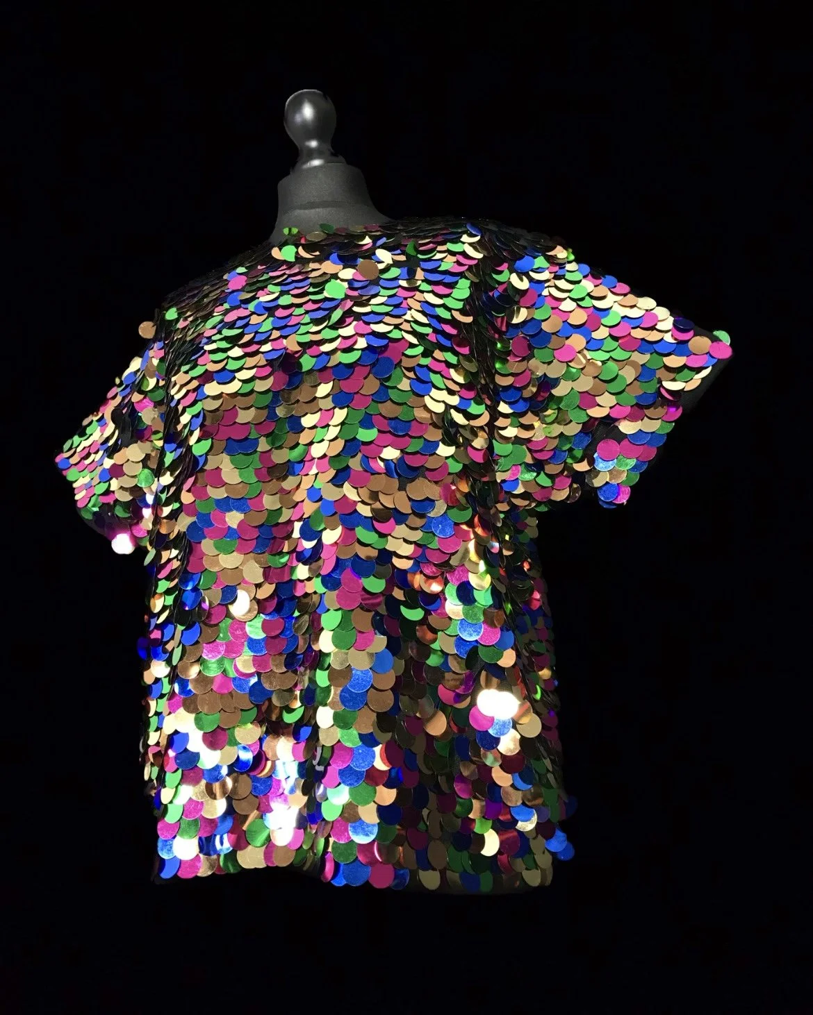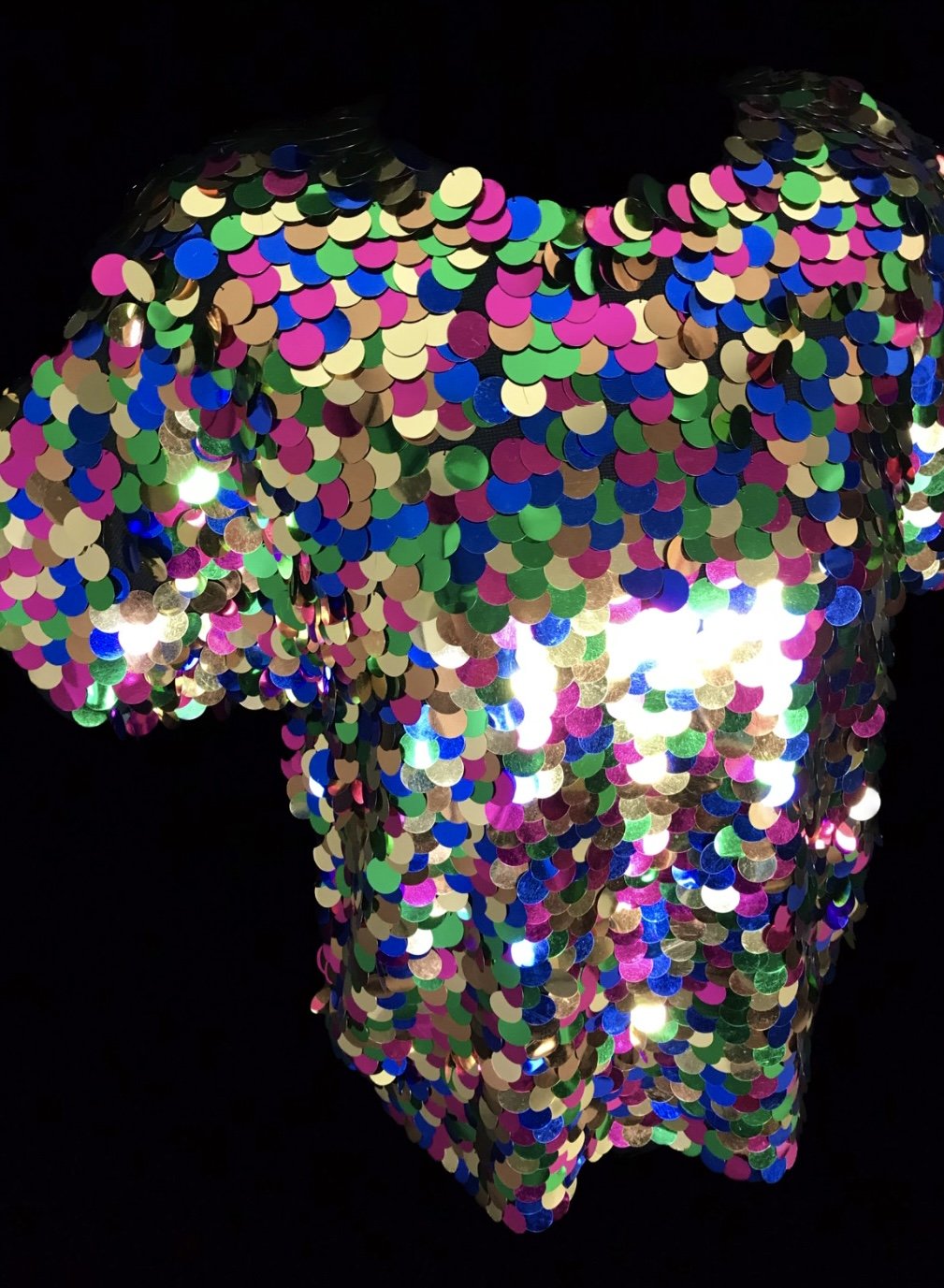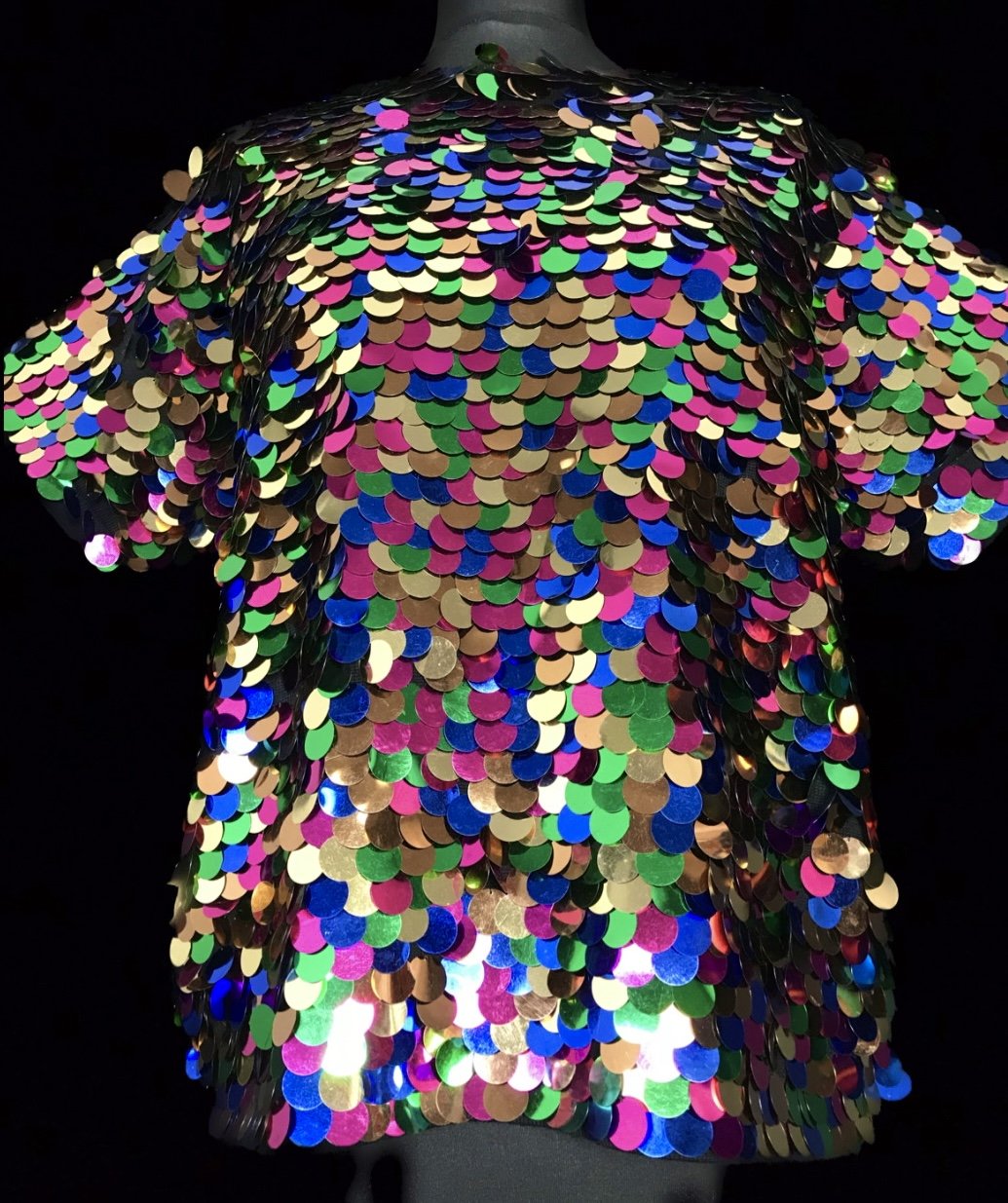 A sensational deadstock top with a rainbow scaled pattern of large sequins in shades of gold, green, pink and blue.