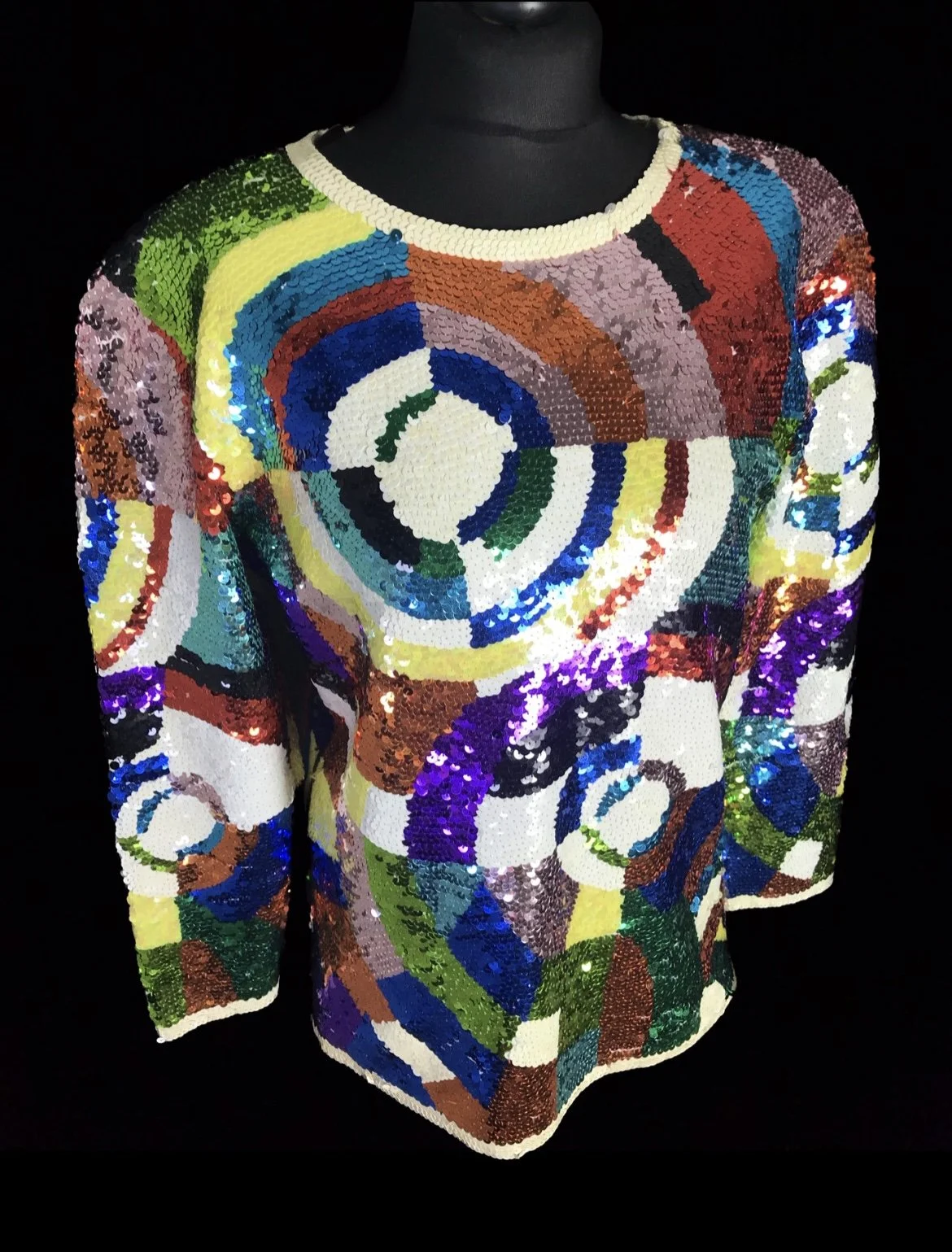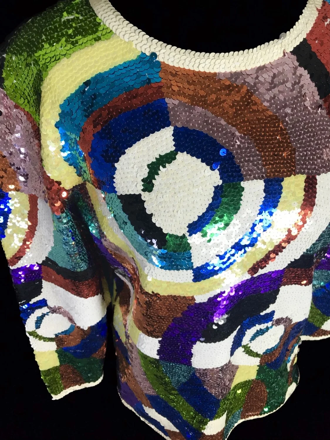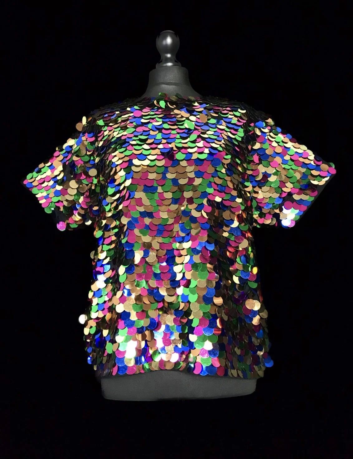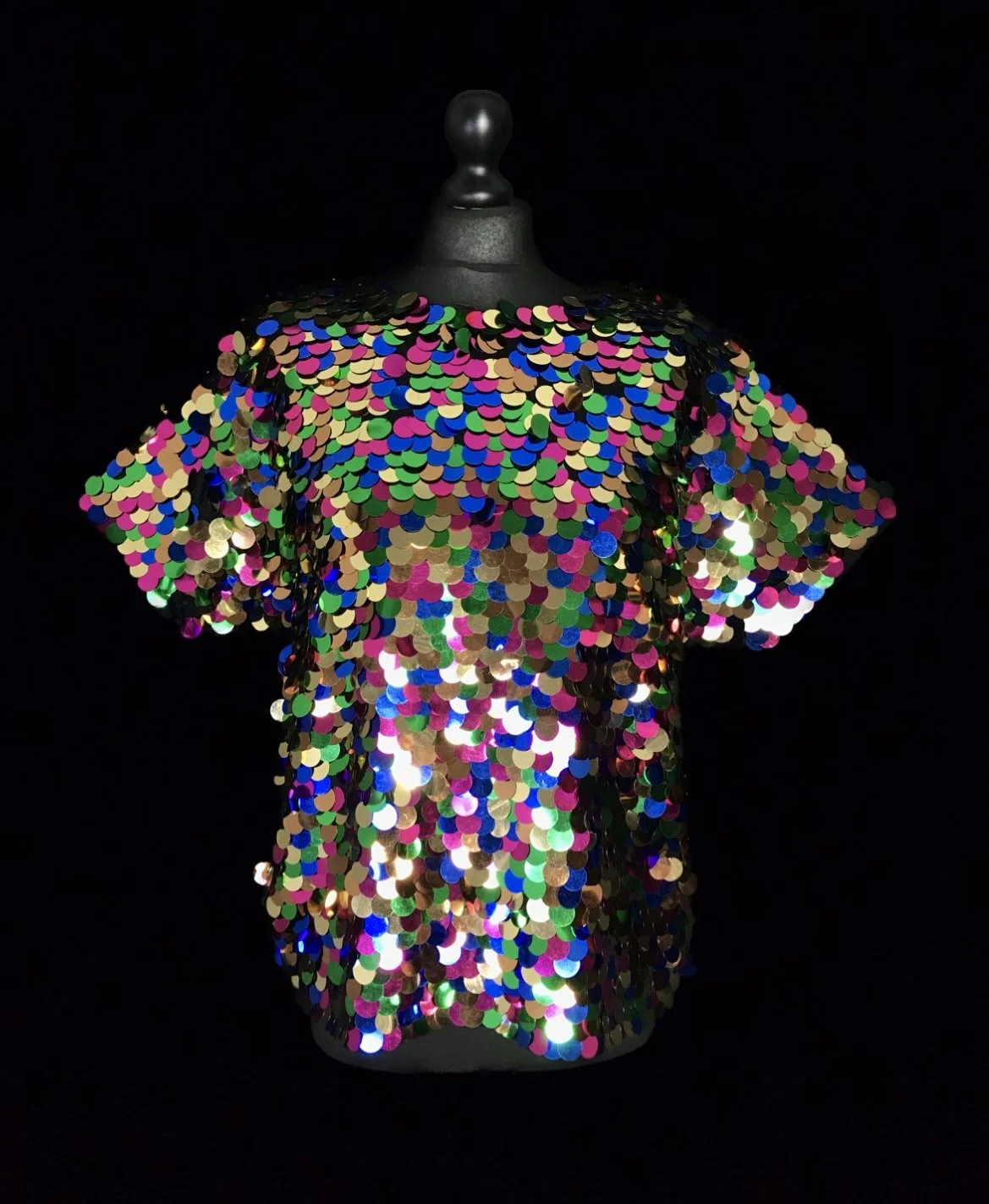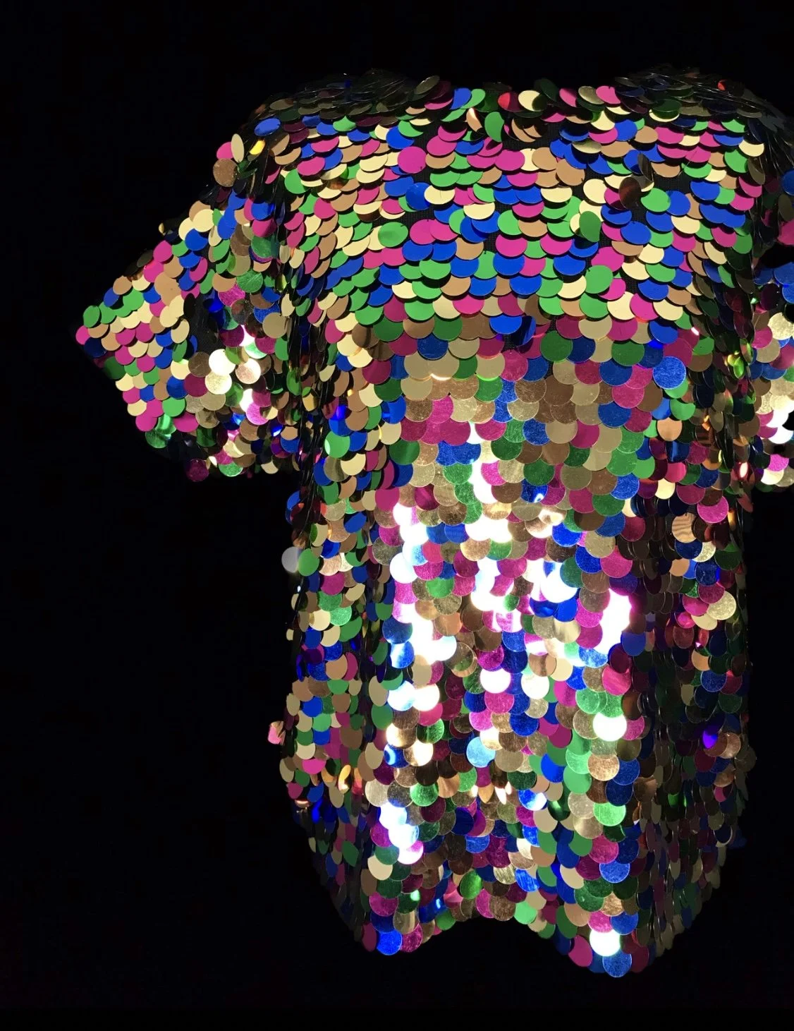 A sensational deadstock top with a rainbow scaled pattern of large sequins in shades of gold, green, pink and blue.
