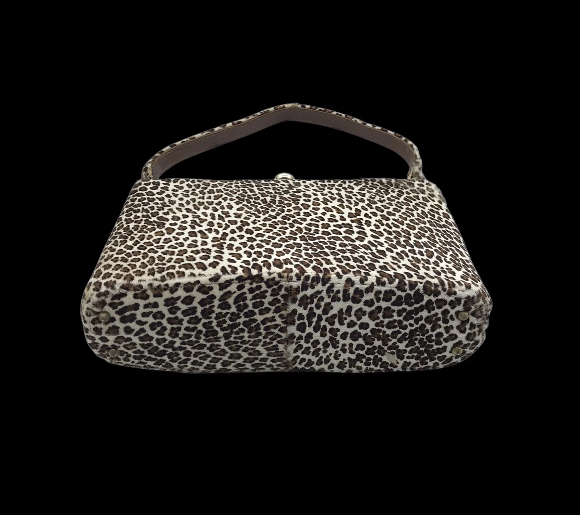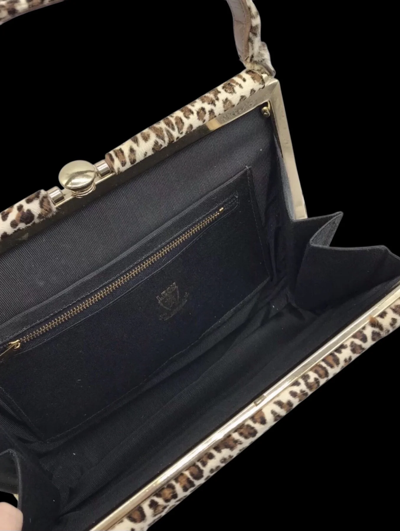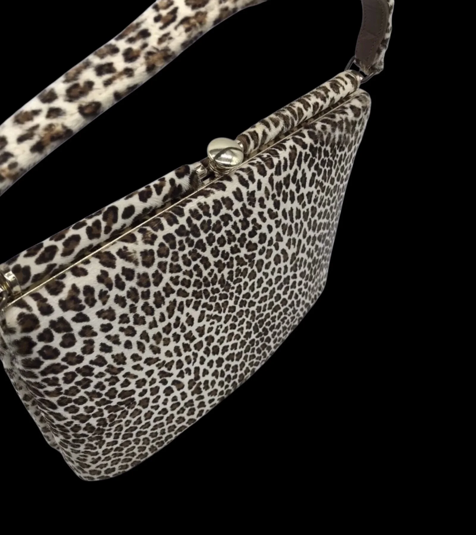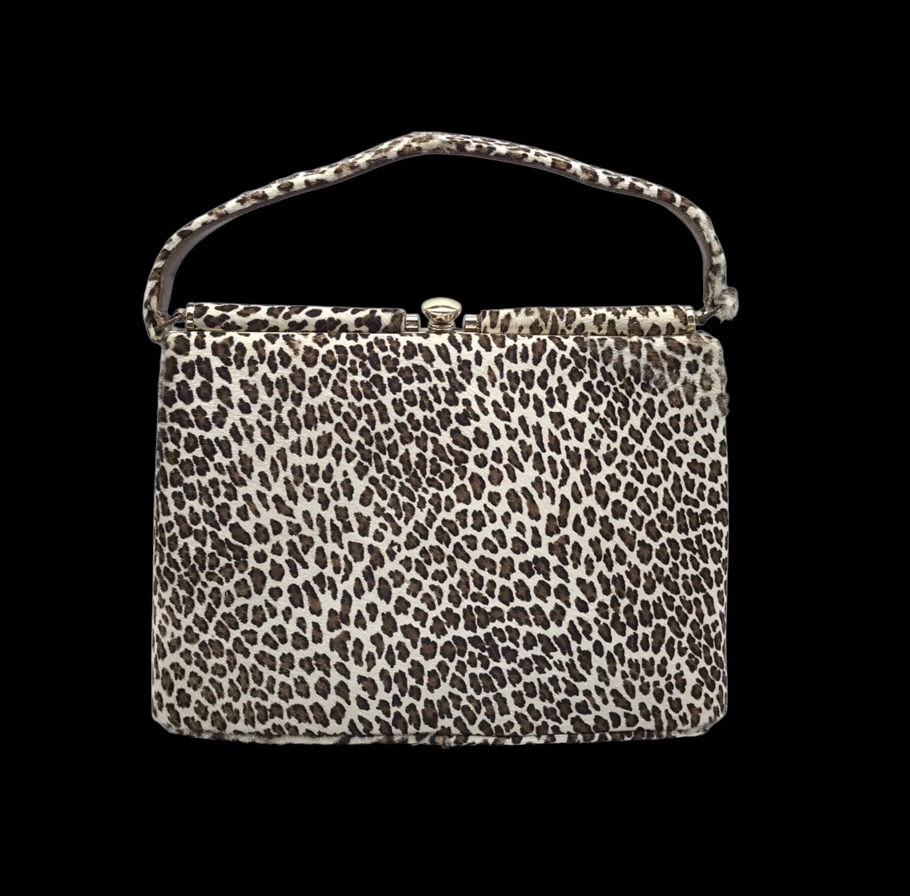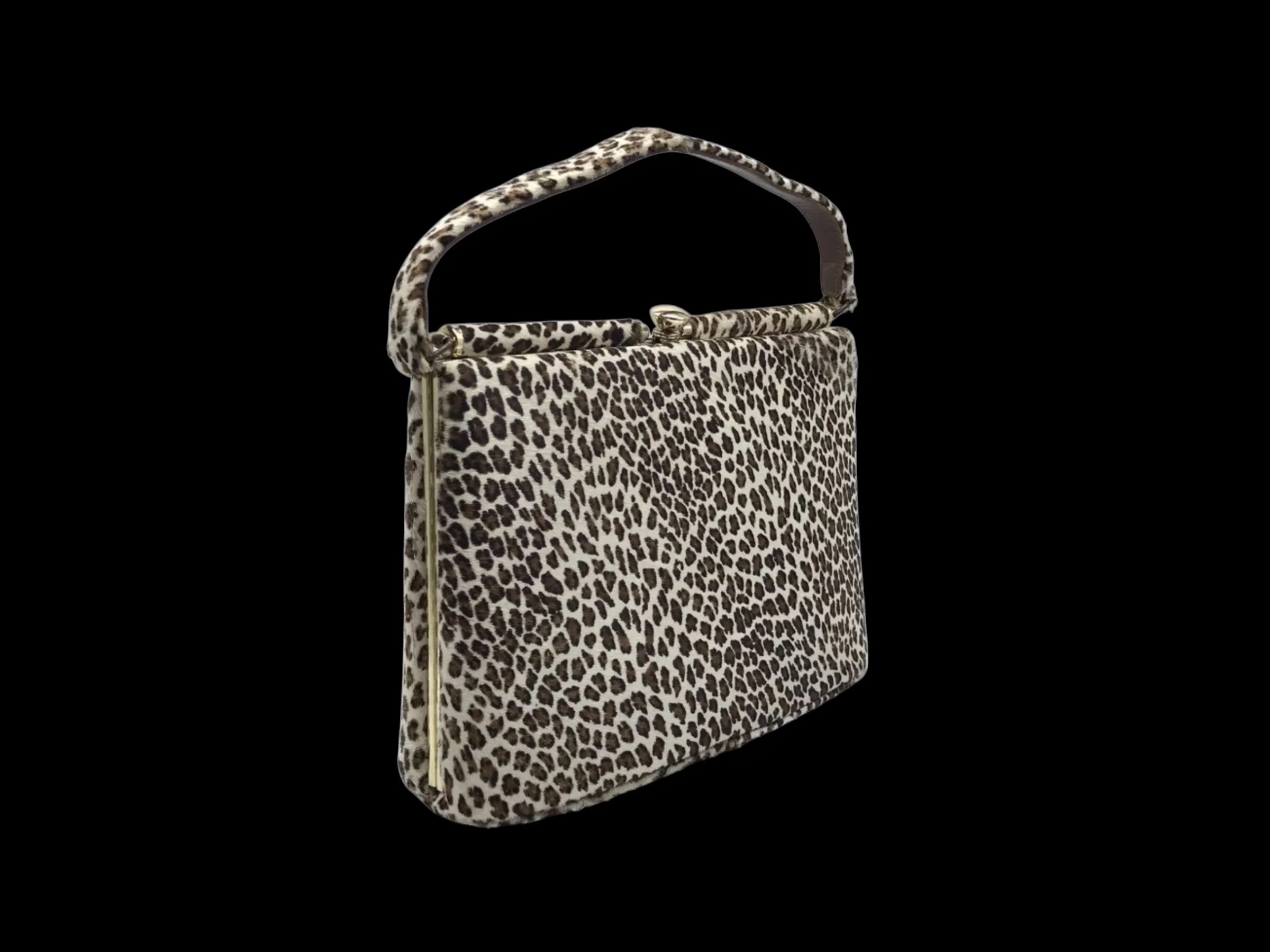 Vintage 1950s/60s handbag in a fabulous animal print ponyskin. Outside is covered in this incredibly soft material, handbag closes with a gold metal clasp. Top frame is solid and handle is leather underneath and ponyskin on top.