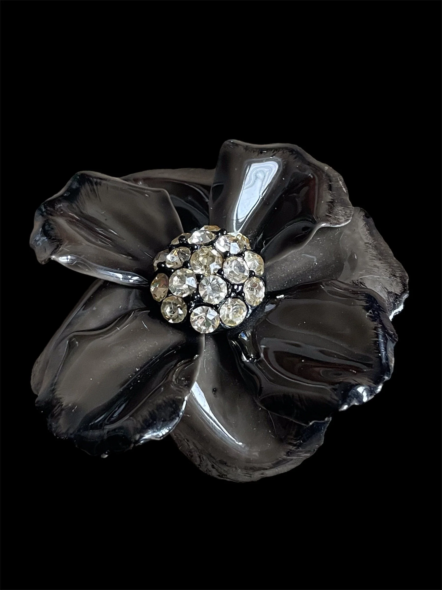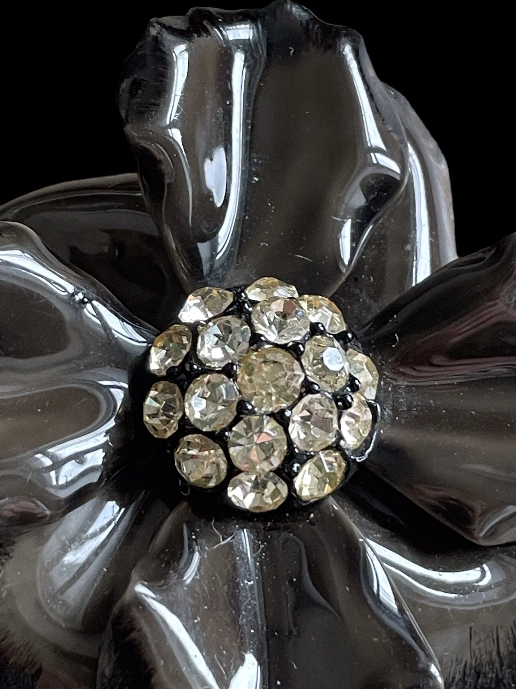 The collapsible handles are a beautiful amber marbled lucite. It closes securely on the top with an ornate gold metal and lucite lock.
