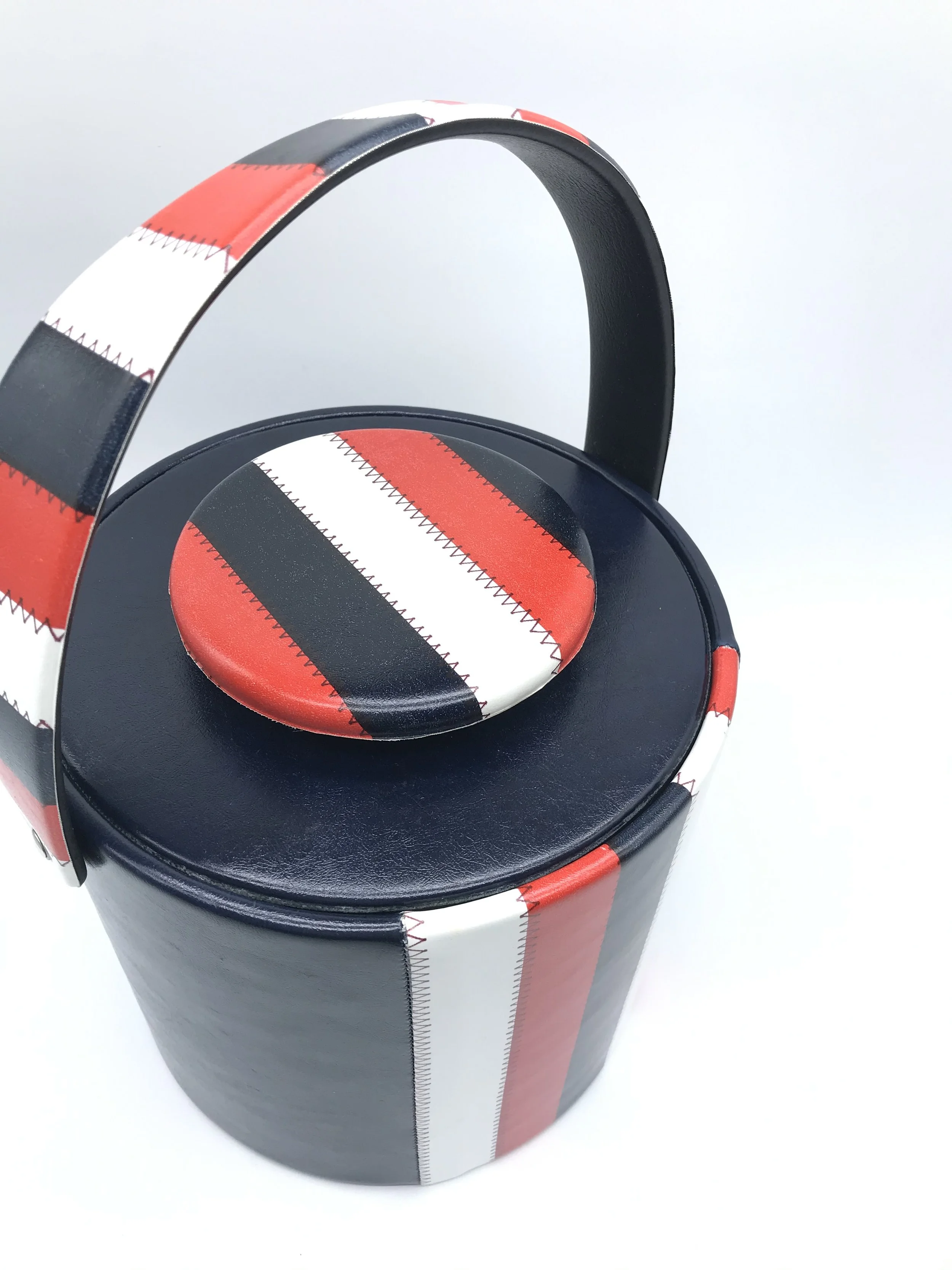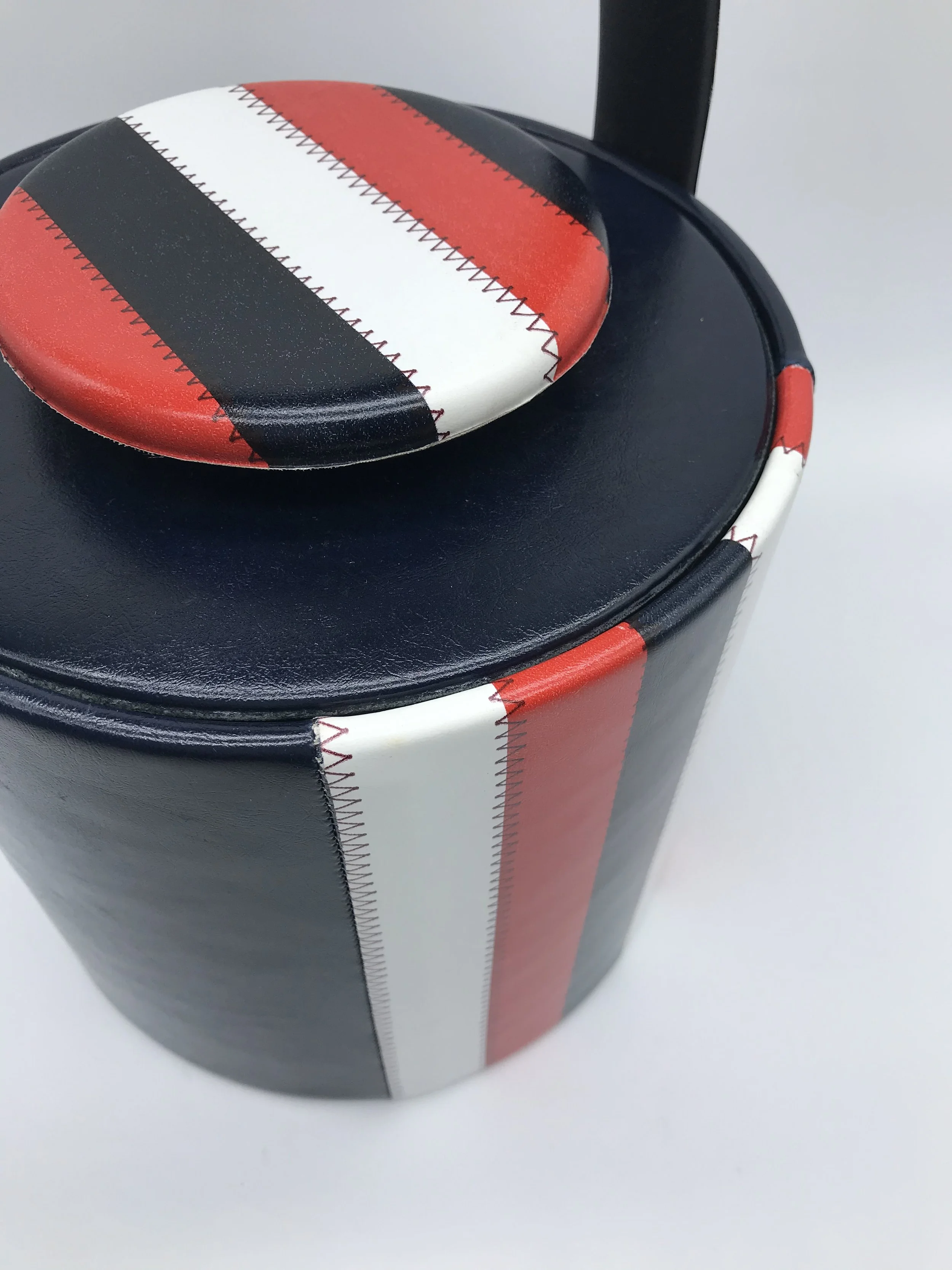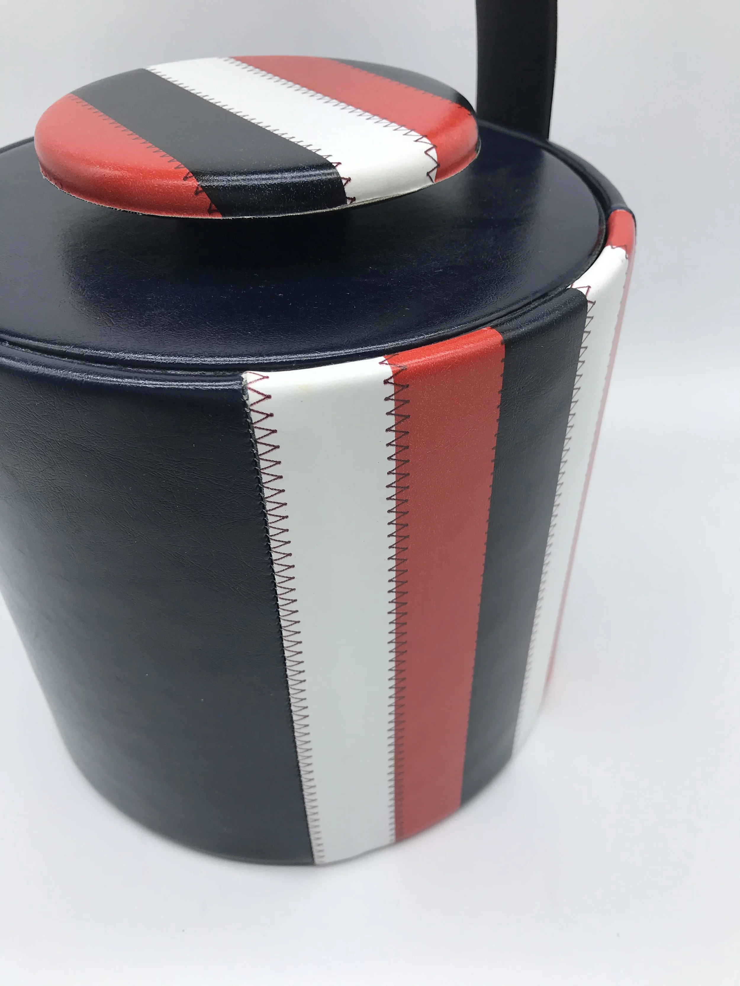 This fantastic ice bucket by Elmar MFG. has a faux leather exterior which is navy blue with red and white stripes. The colour pattern is repeated on the carry handle and the lid handle.