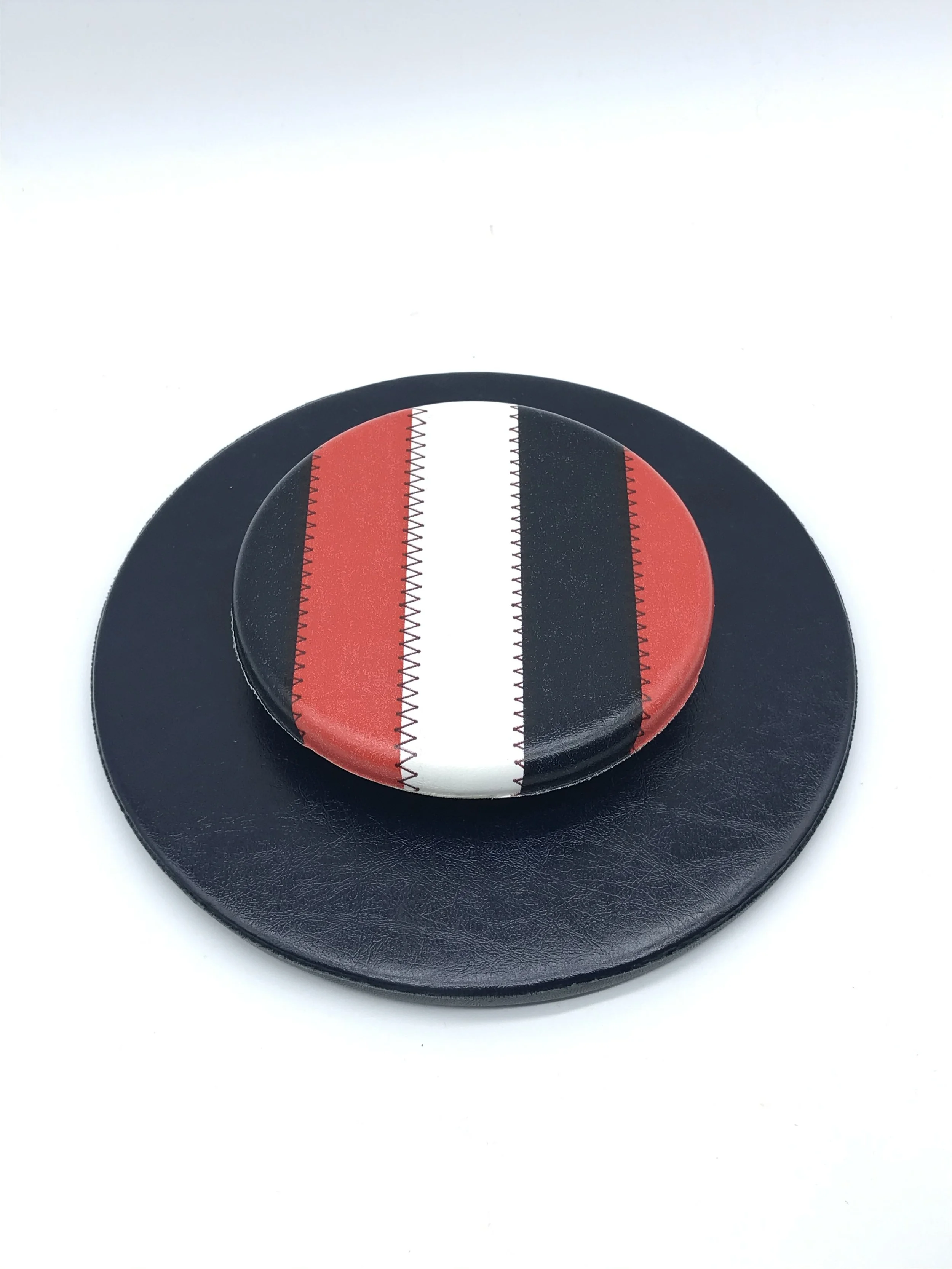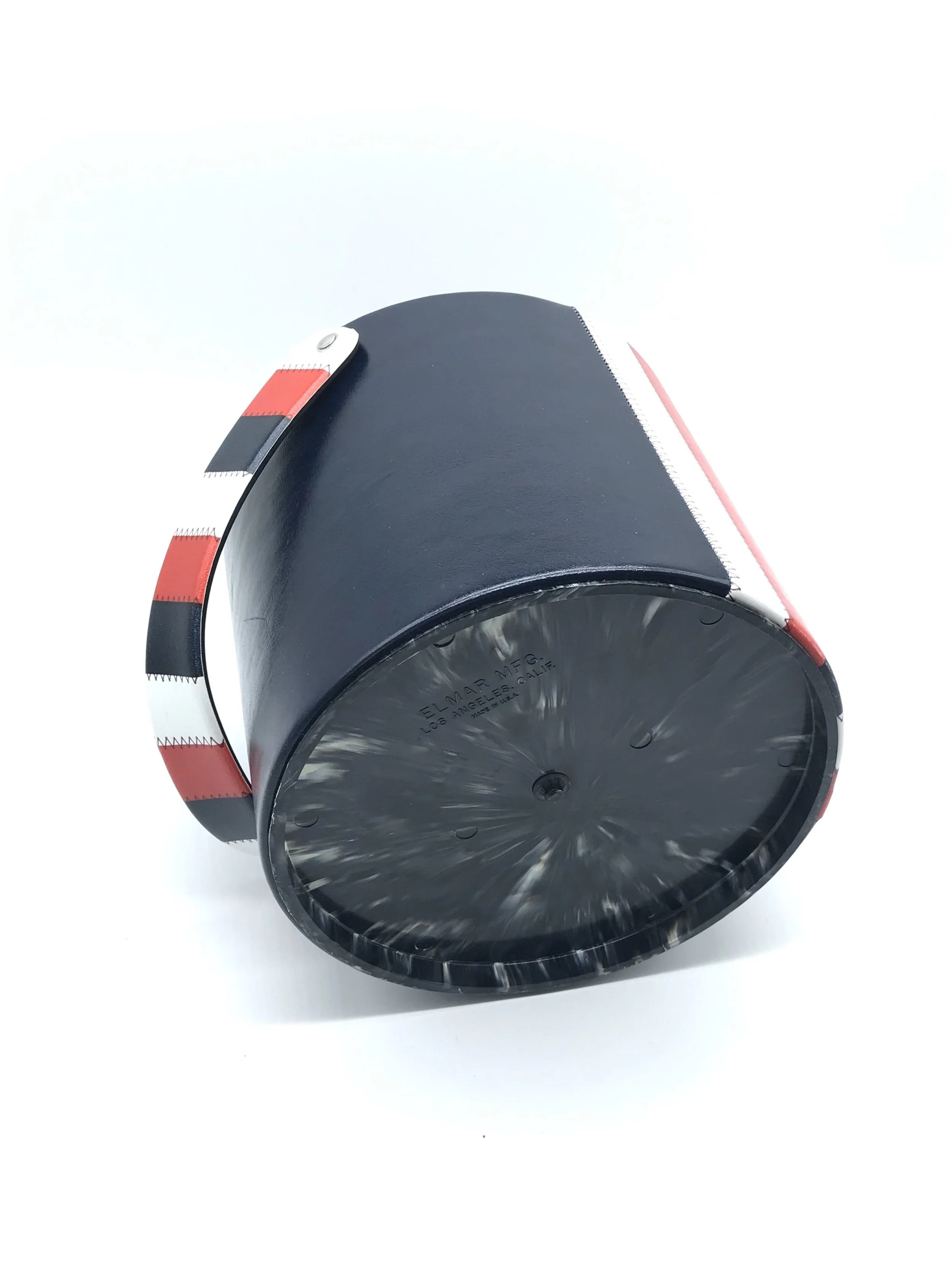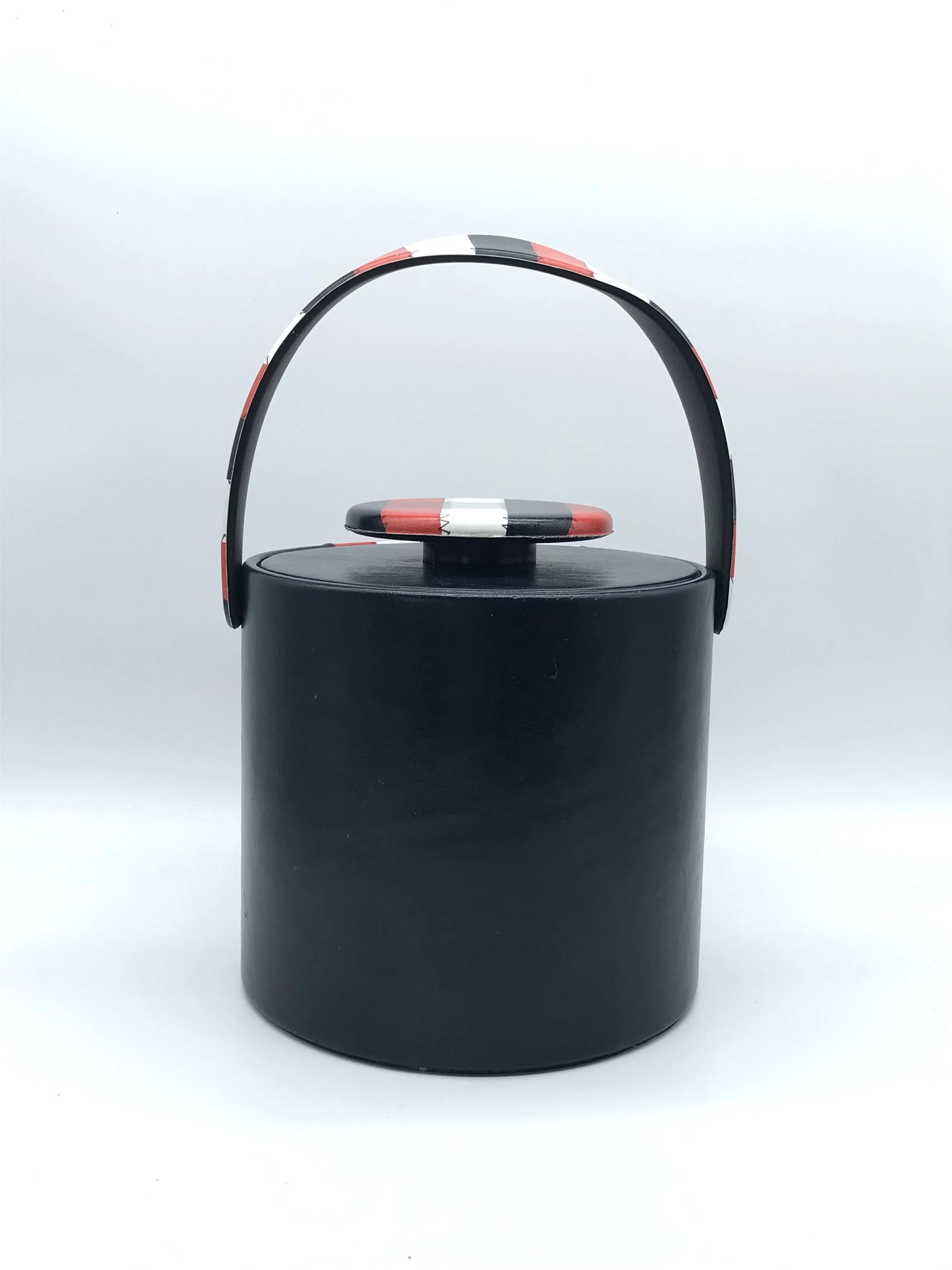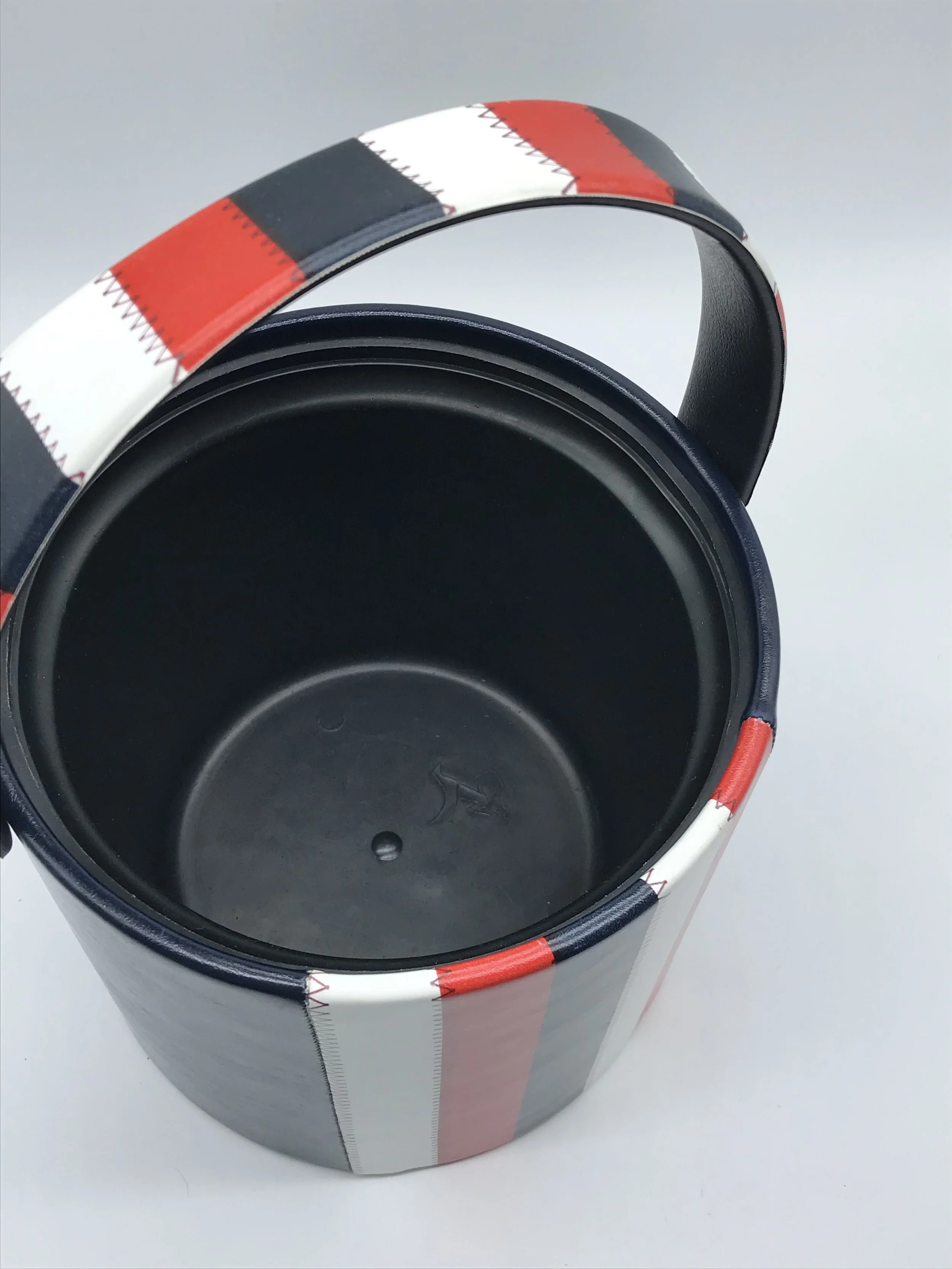 This fantastic ice bucket by Elmar MFG. has a faux leather exterior which is navy blue with red and white stripes. The colour pattern is repeated on the carry handle and the lid handle.