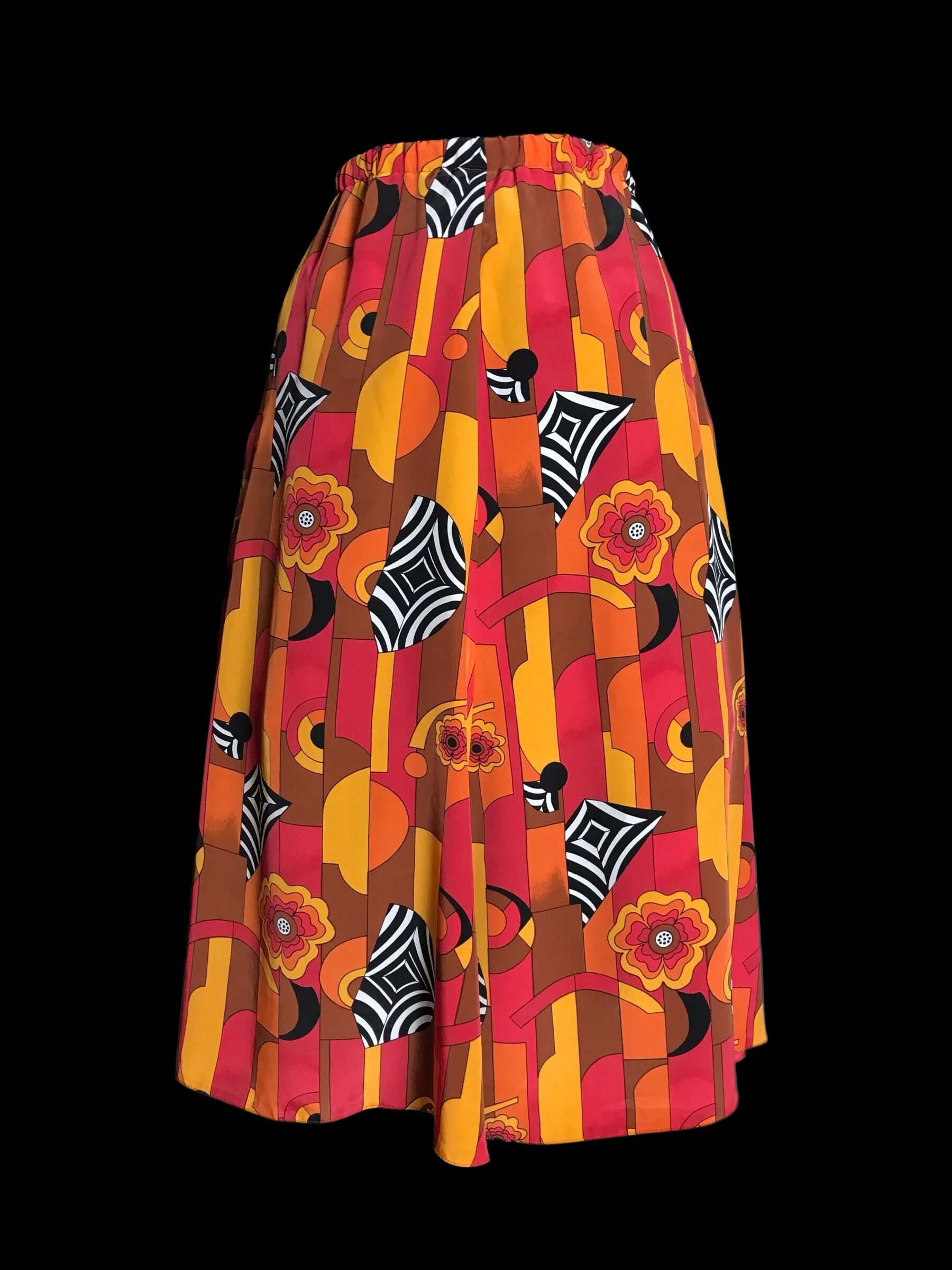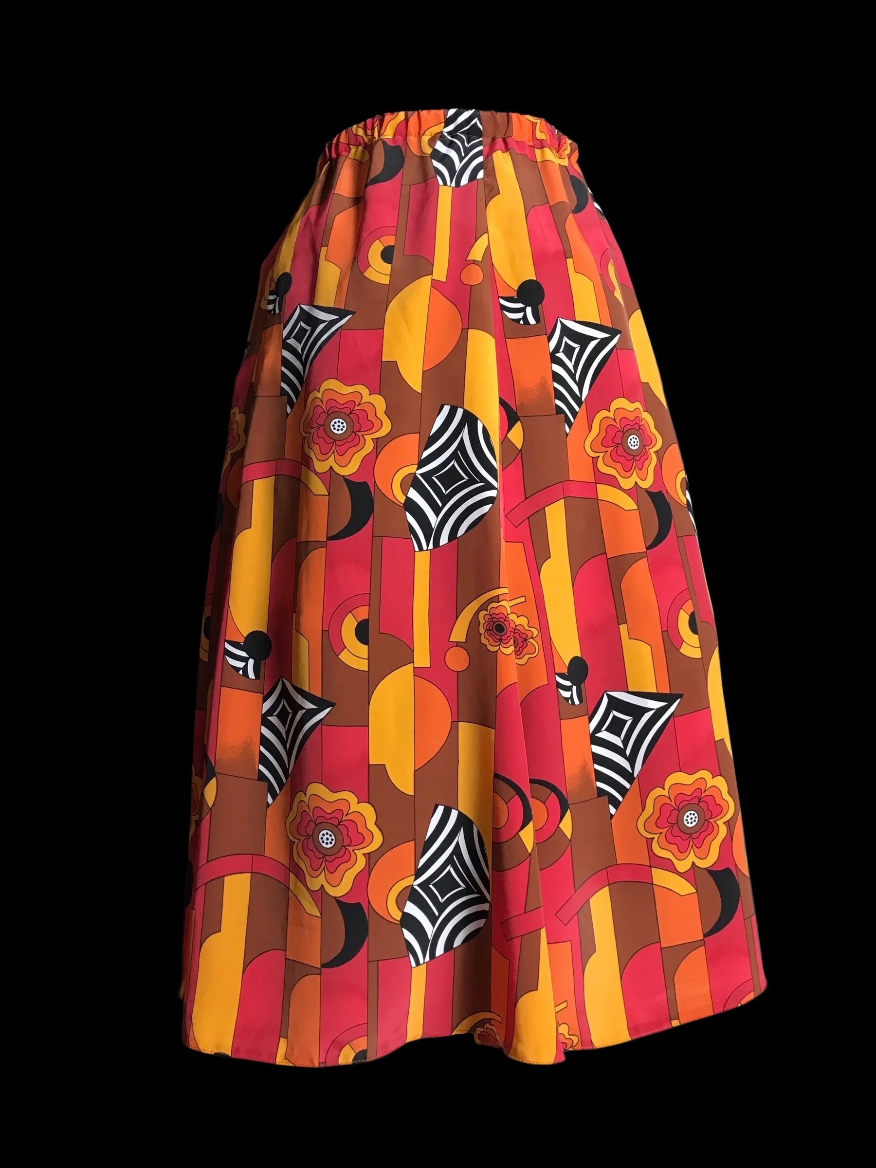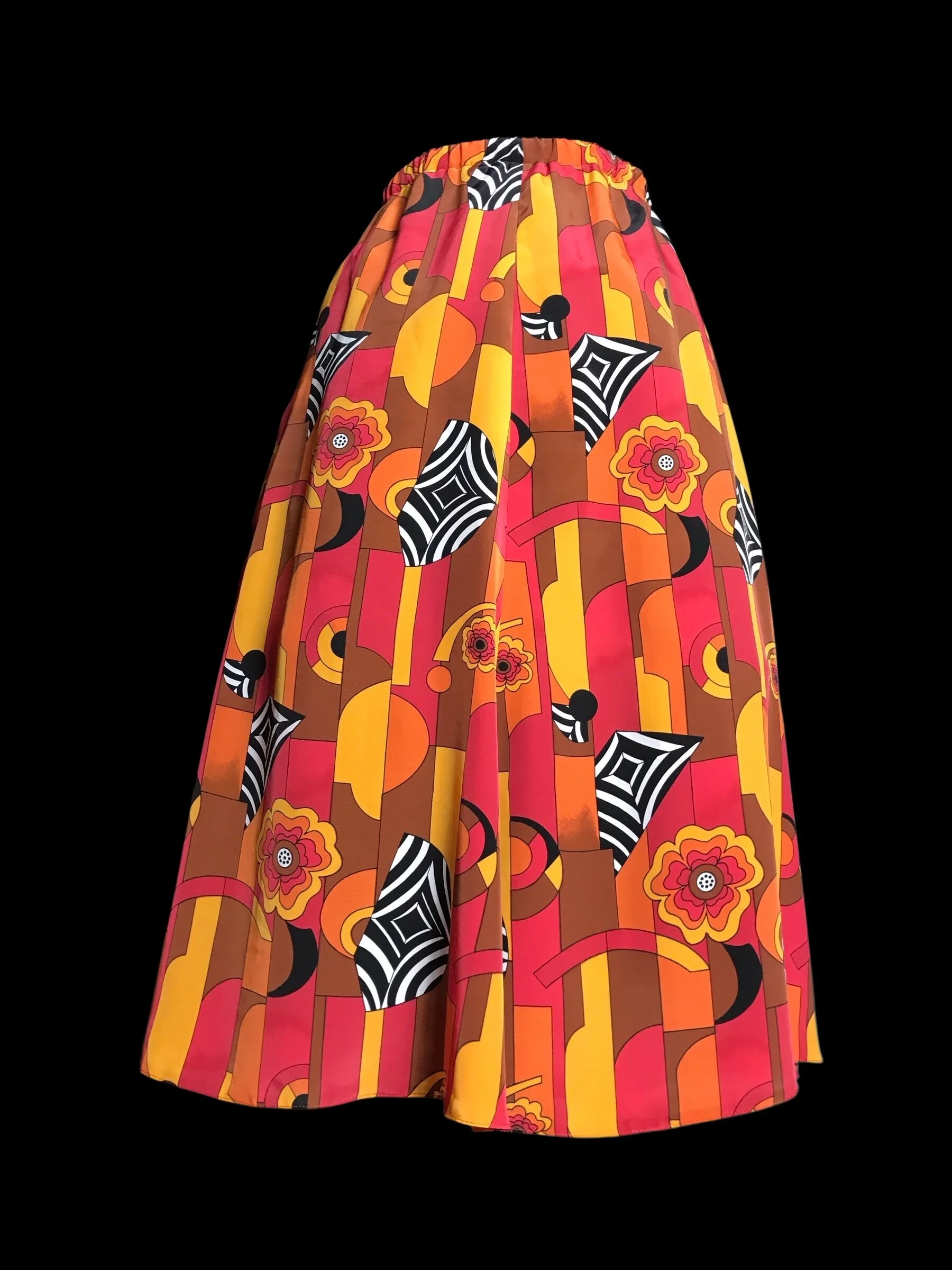 This wonderful skirt is accordian pleated from waist to hem and has a catchy pattern of black marker squiggles on a yellow/mustard background.