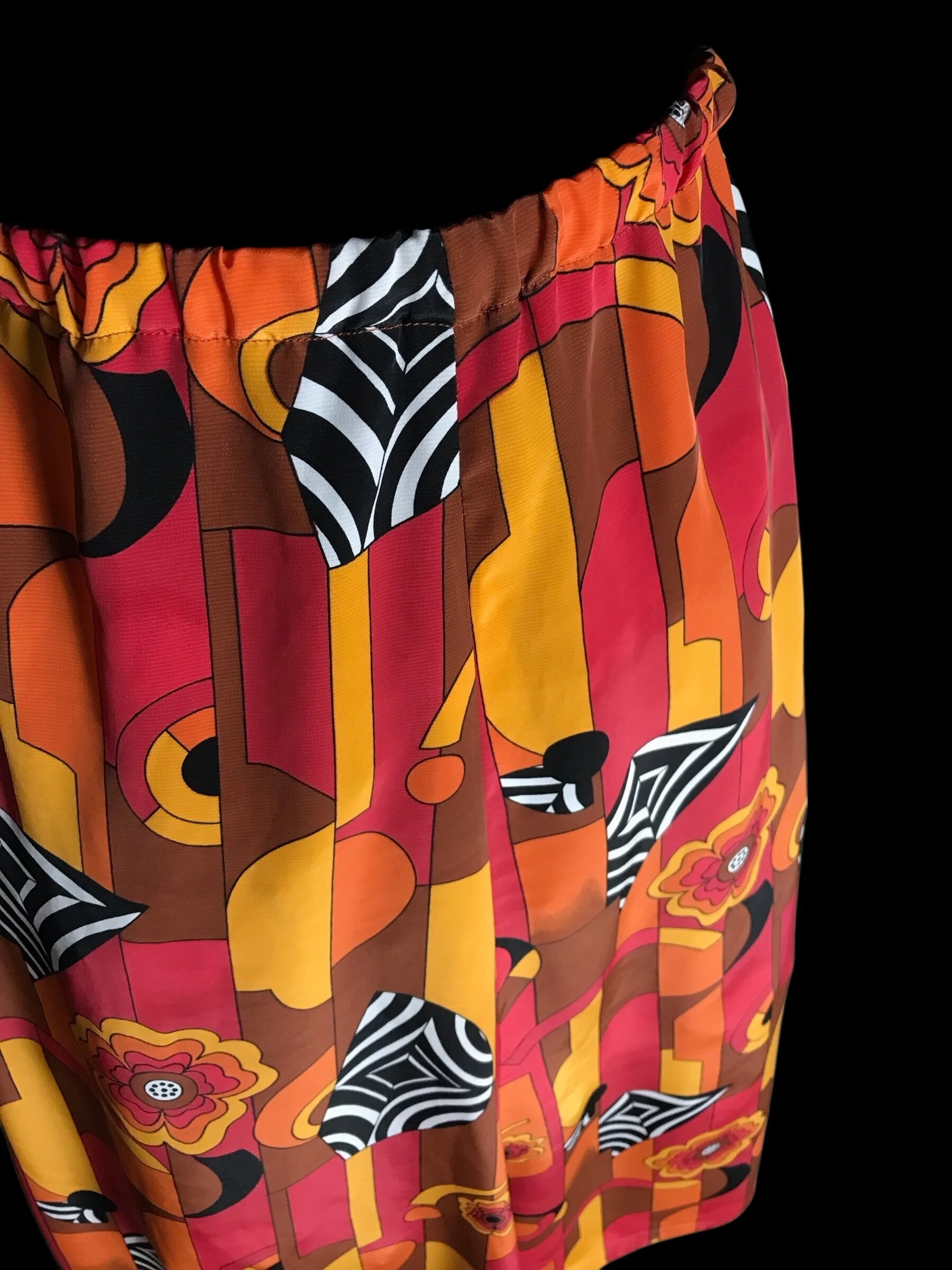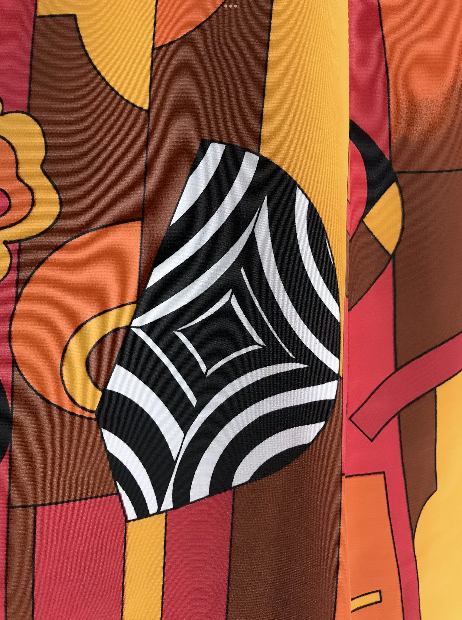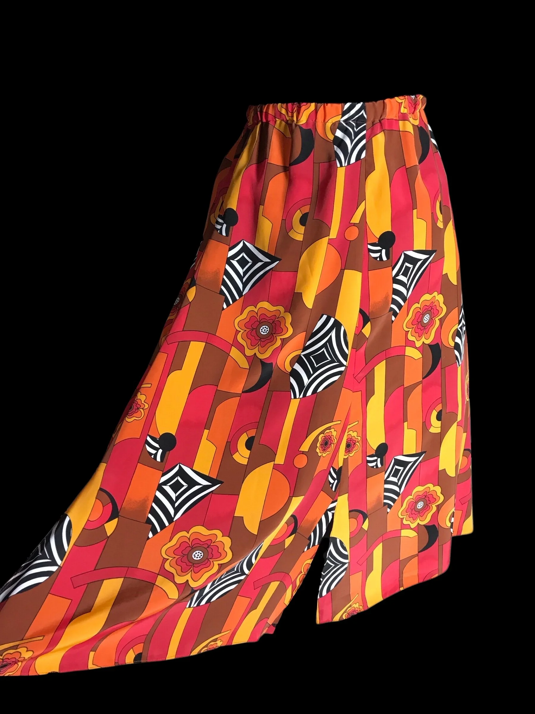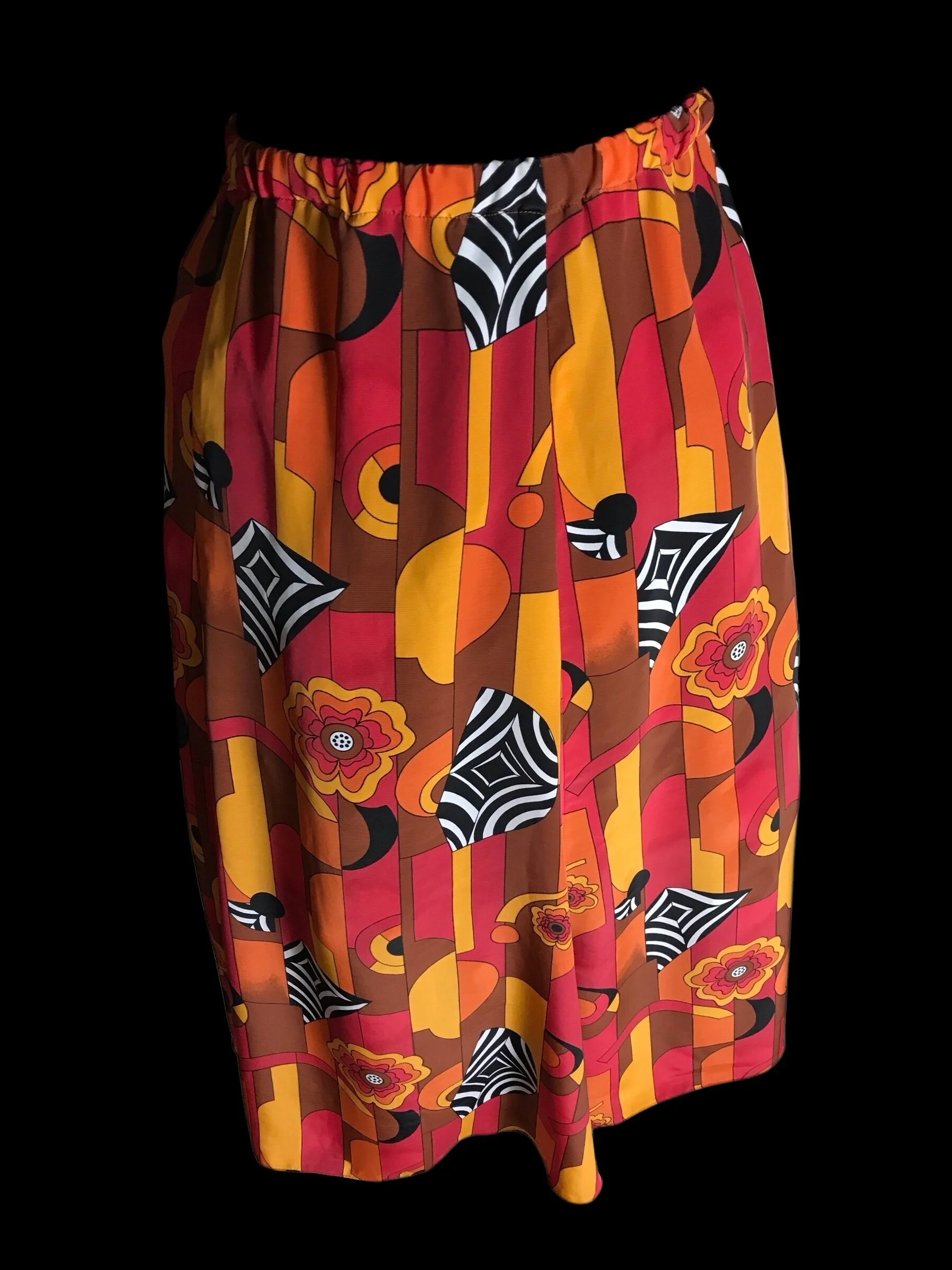 This wonderful skirt is accordian pleated from waist to hem and has a catchy pattern of black marker squiggles on a yellow/mustard background.