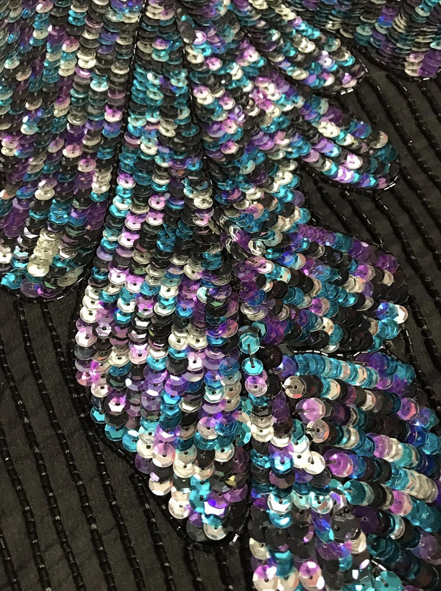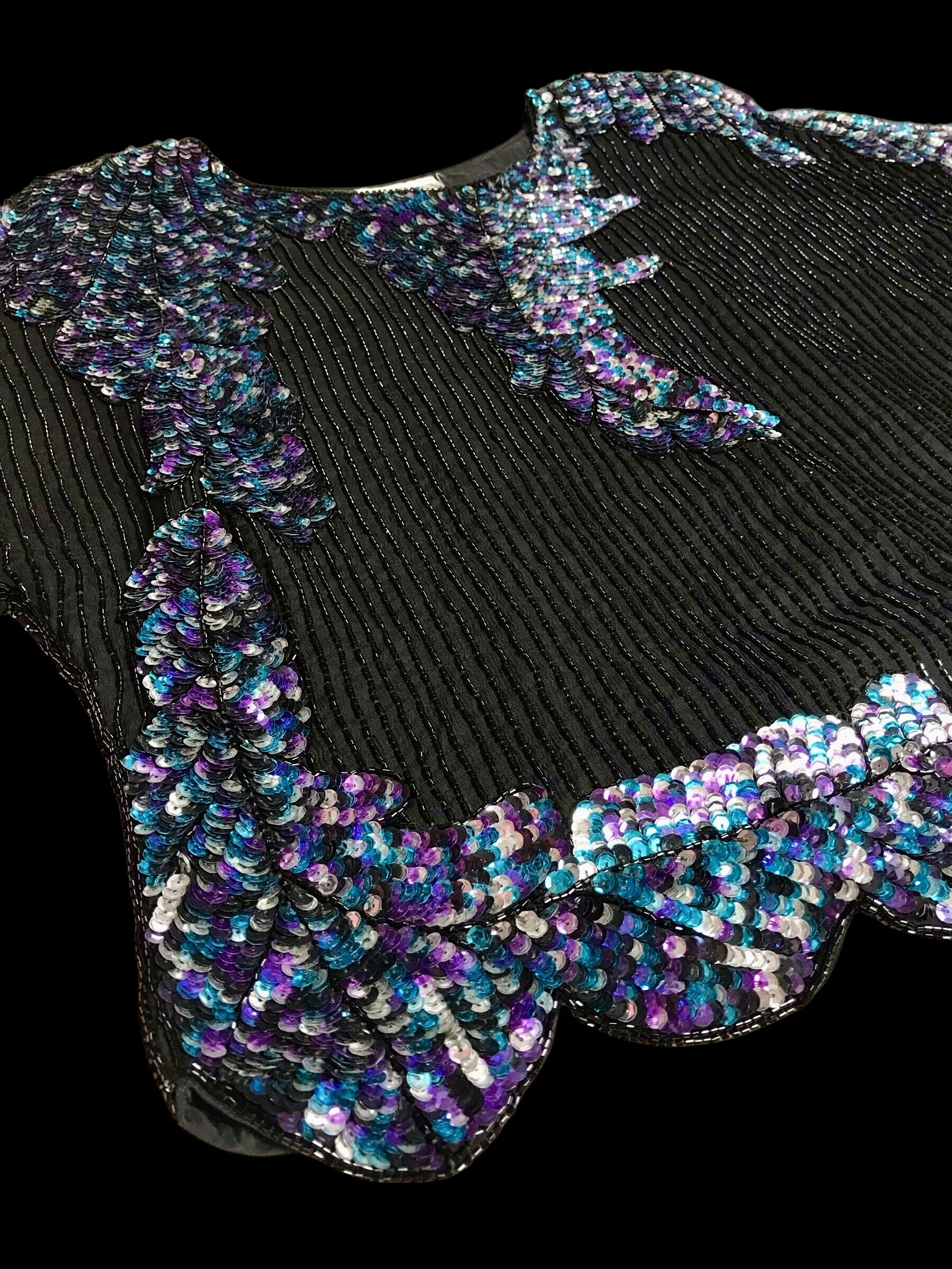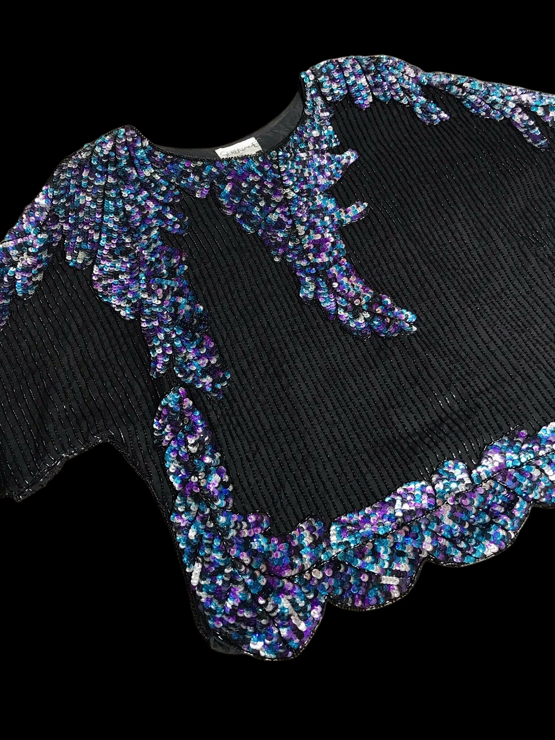 A really stunning batwing top in metallic red, pink, blue, green and black sequins. The surround pattern is of colourful Zigzags above a black section adorned with small pearlescent beads. The zig-zagged hem and cuffs are adorned with larger black peardrop sequins and tiny bugle beads.