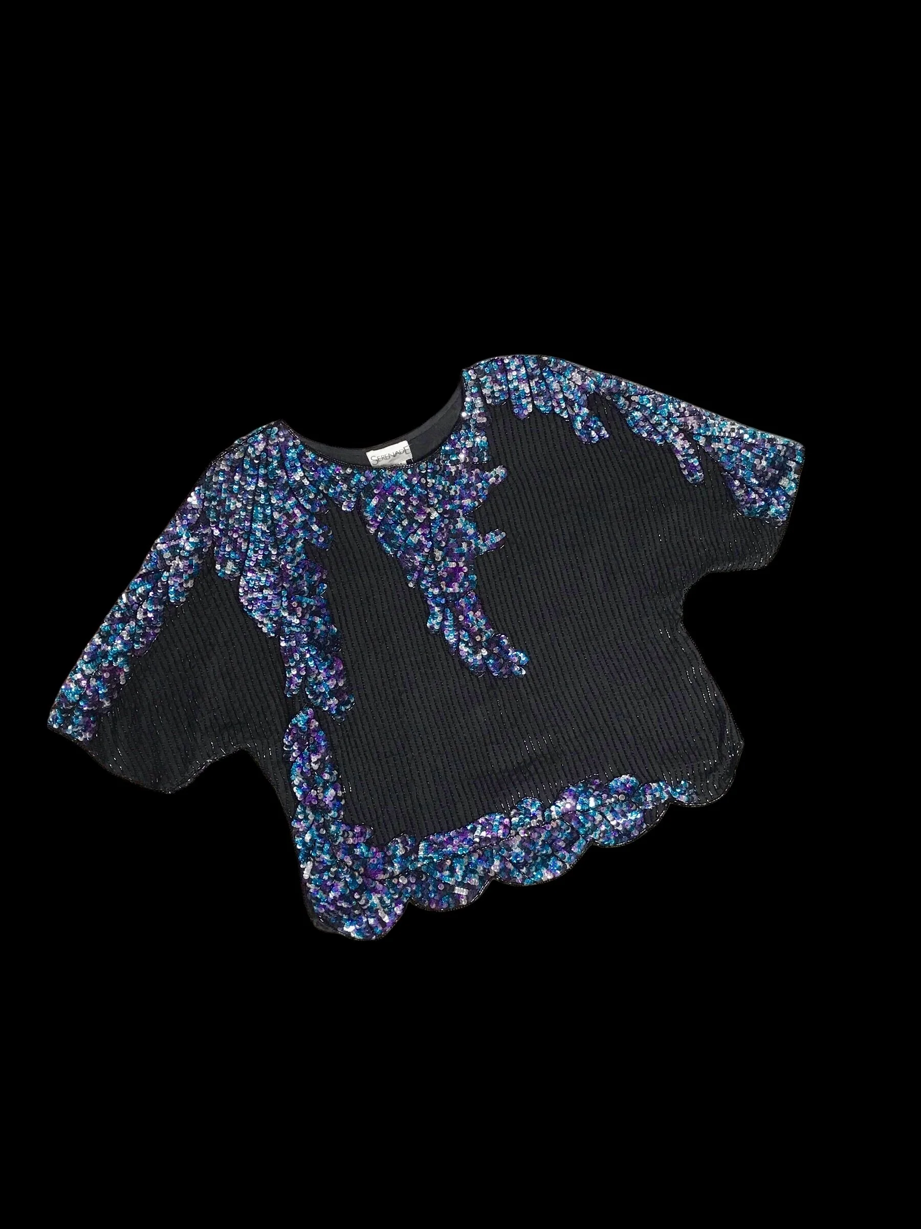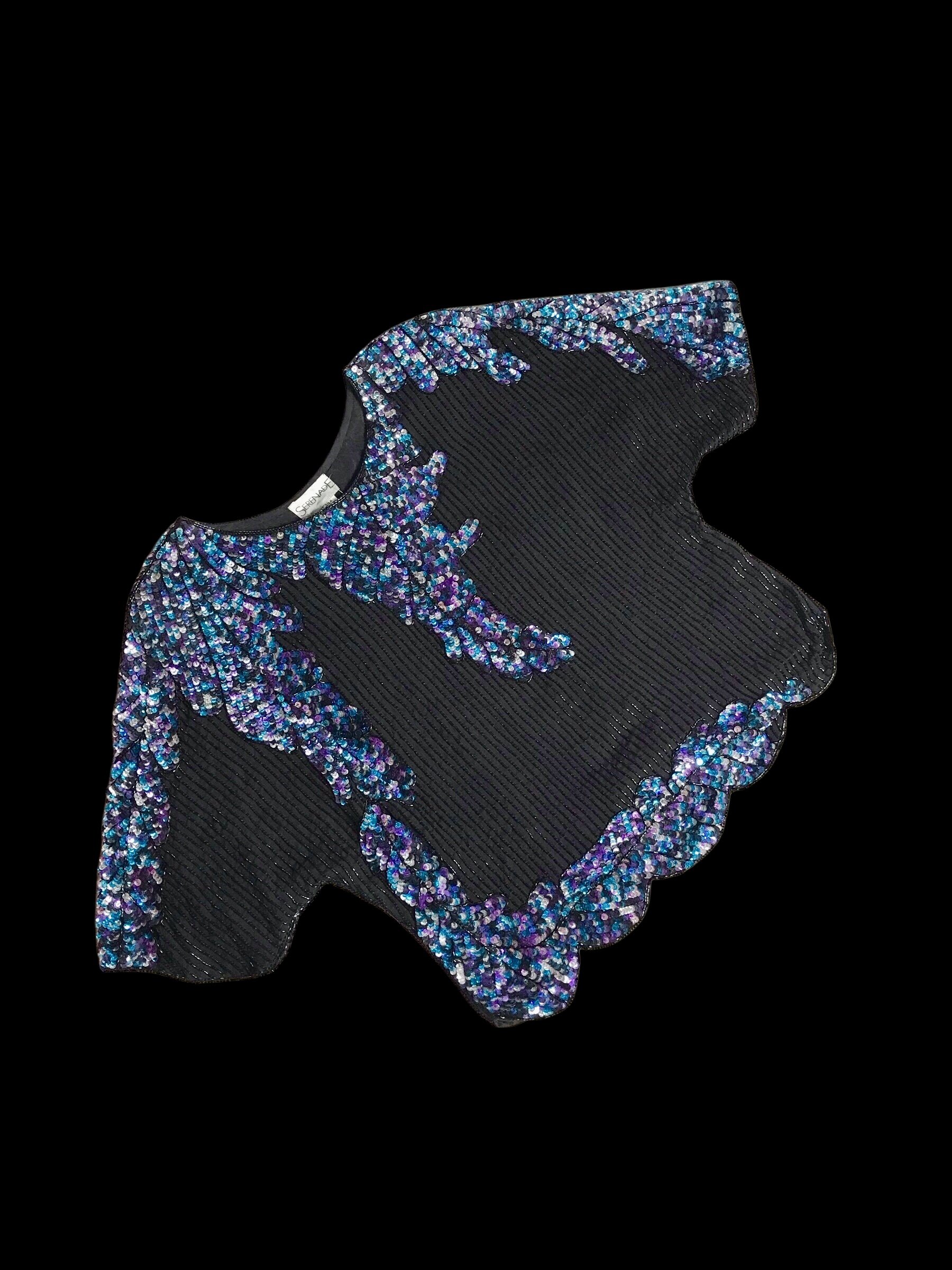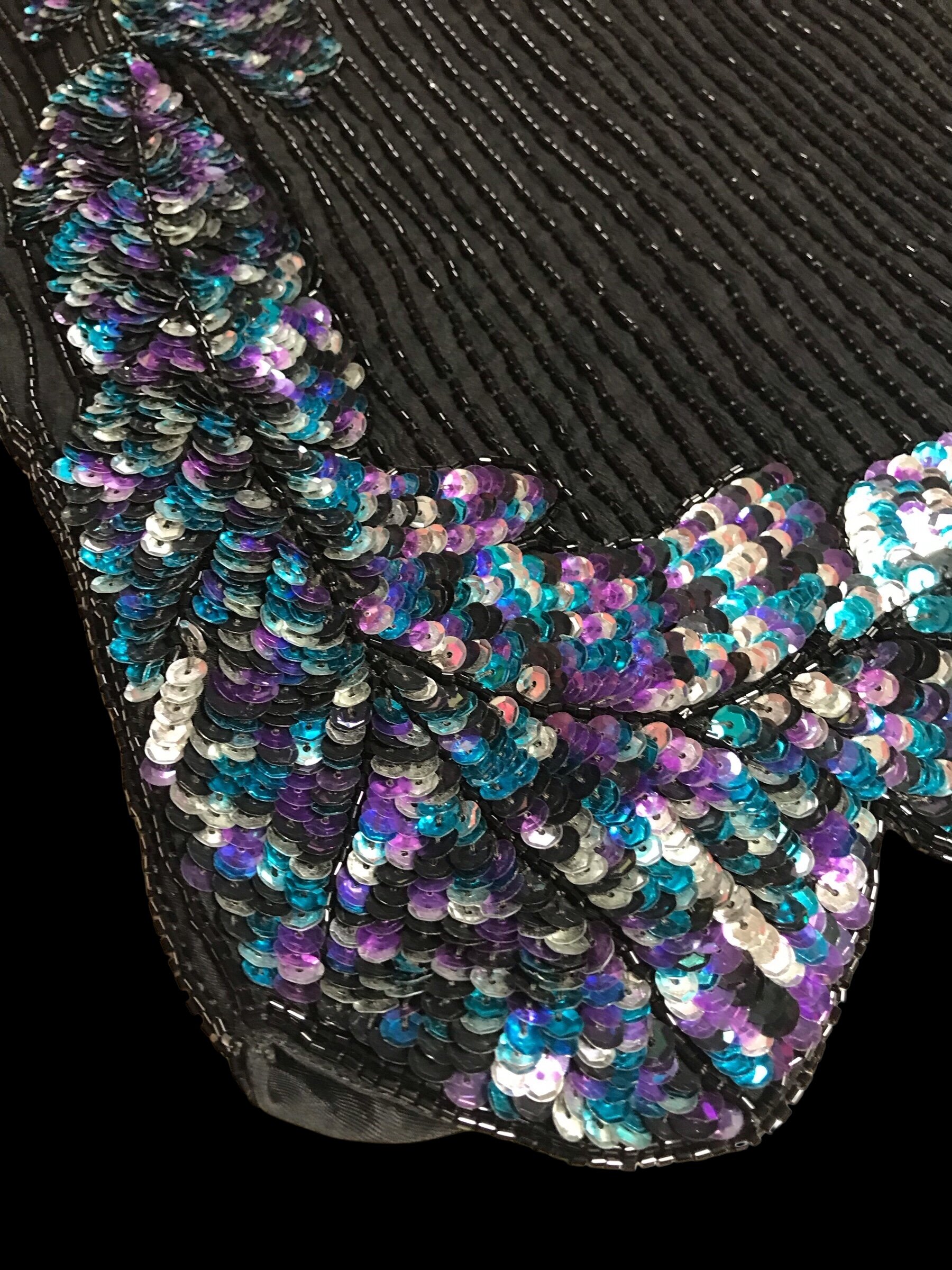 A really stunning batwing top in metallic red, pink, blue, green and black sequins. The surround pattern is of colourful Zigzags above a black section adorned with small pearlescent beads. The zig-zagged hem and cuffs are adorned with larger black peardrop sequins and tiny bugle beads.