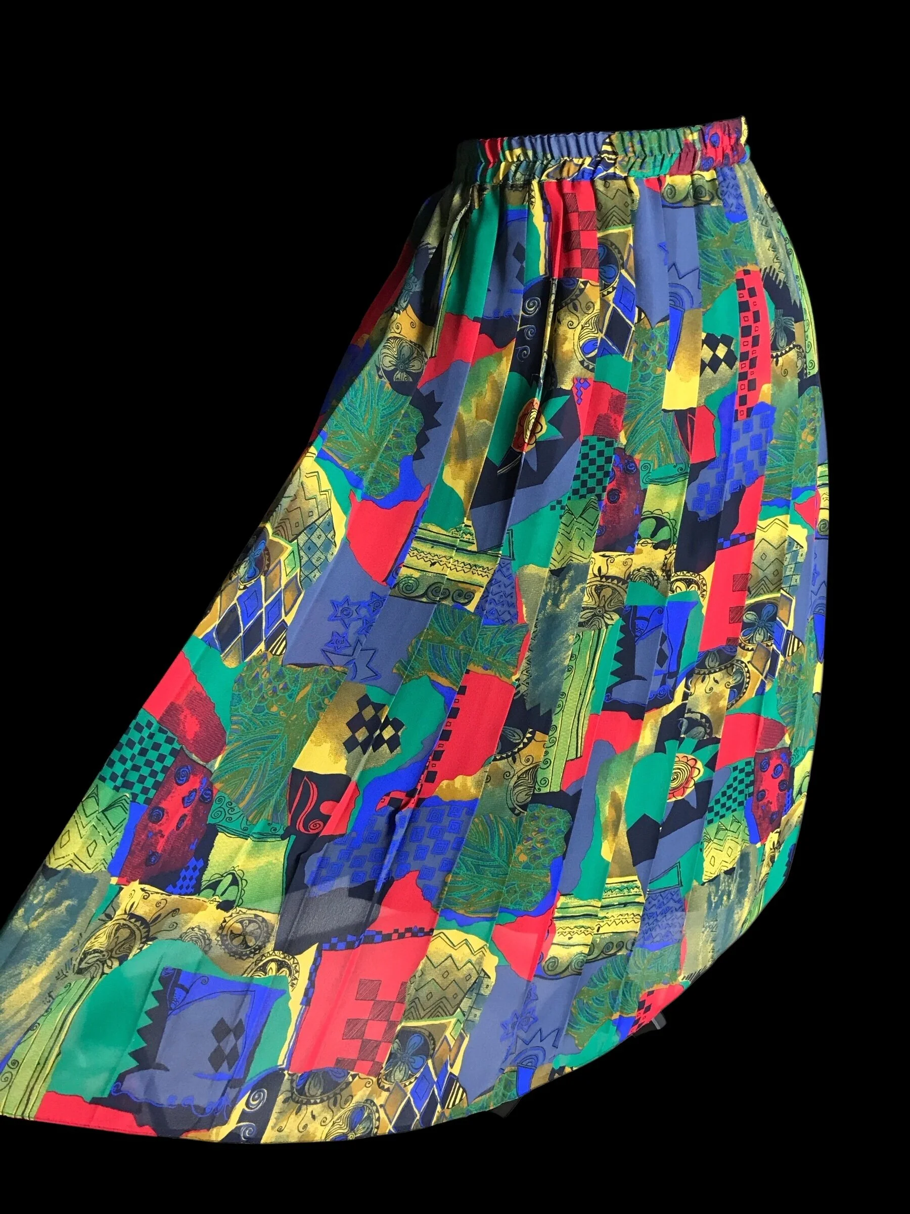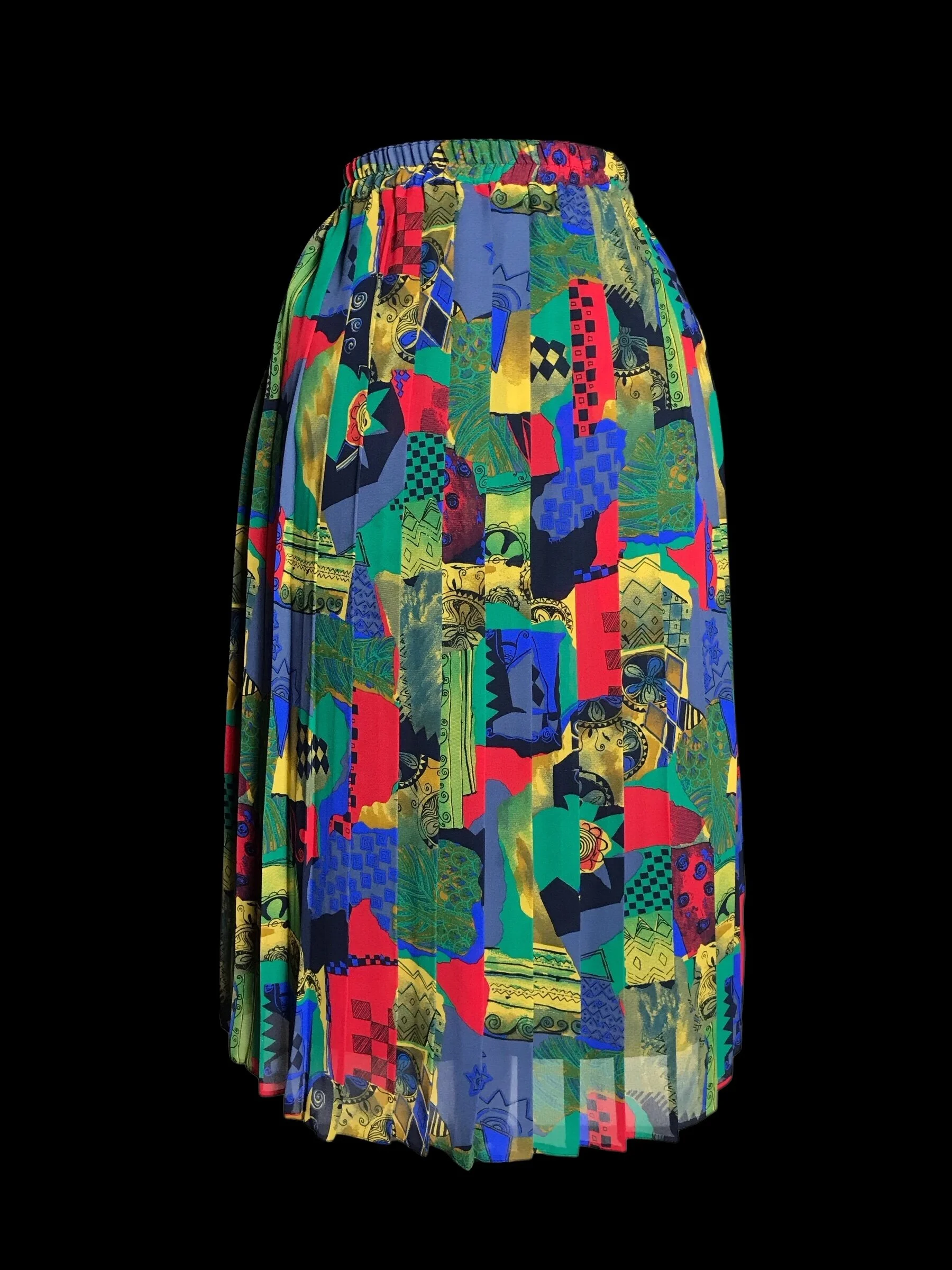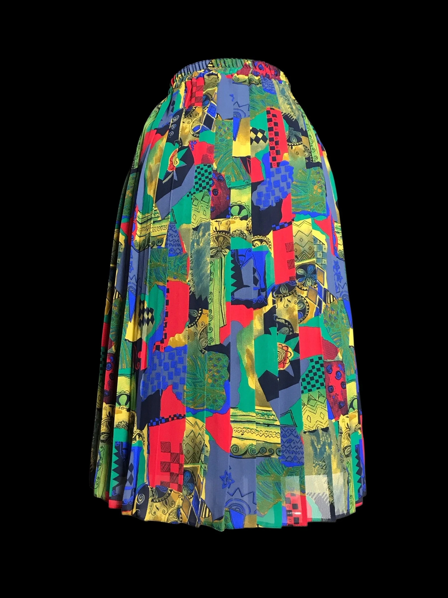 This stunning skirt from Hamells has an abstract almost fruity pattern in bold bright shades of red, orange, yellow, green, pink and white. The skirt is fully pleated from the elasticated waist to the hem.