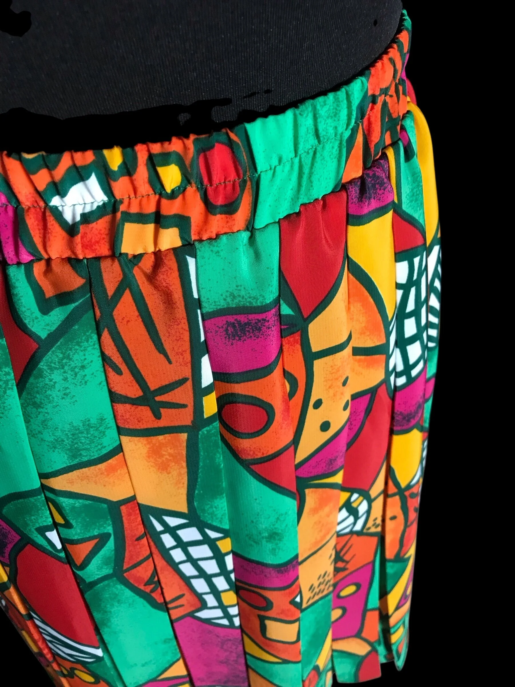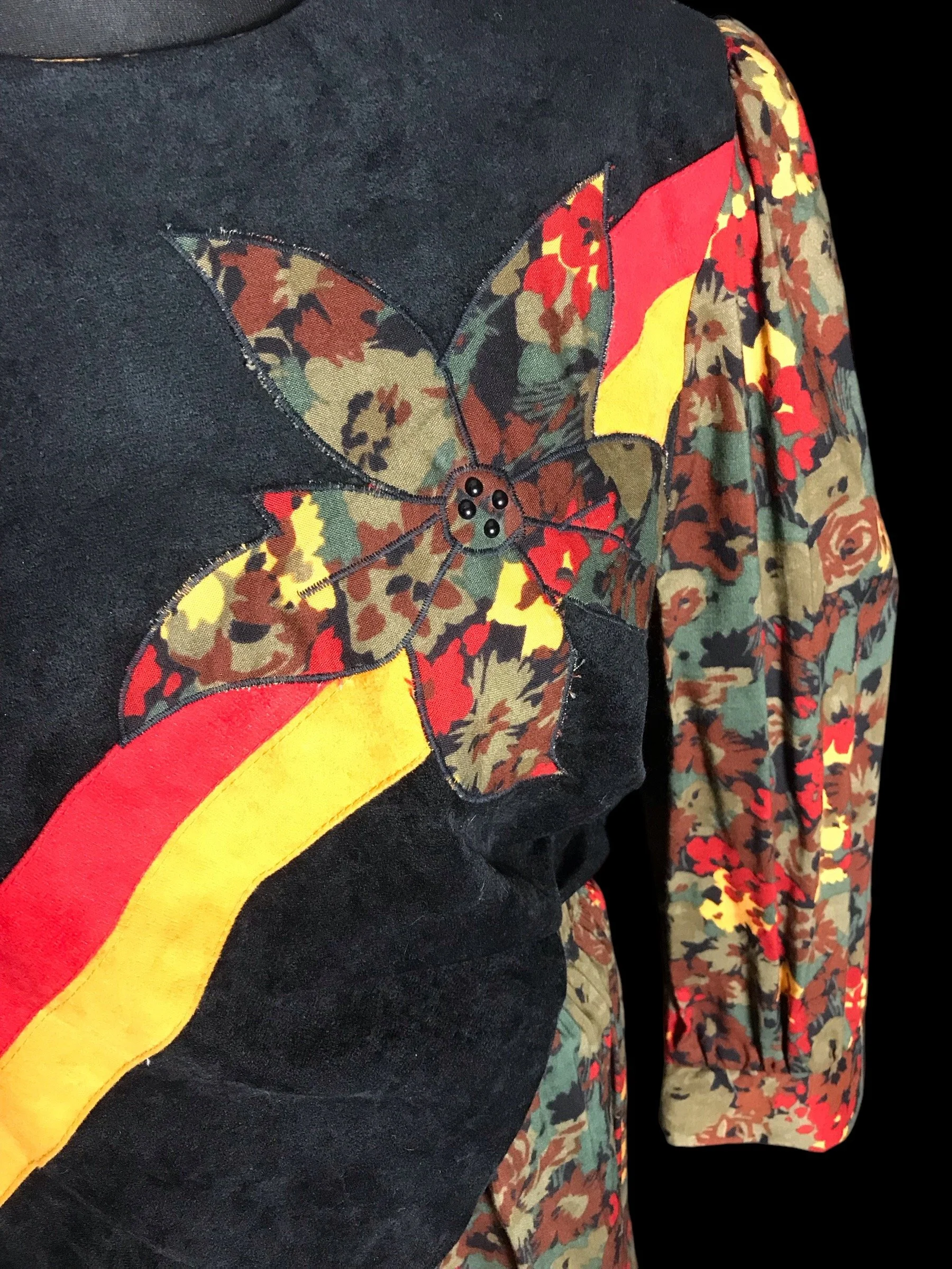 It includes bold shades of red, gold, green, brown, khaki and black. The black torso is embellished on the front with a yellow and red stripe centred with a large 5-leaf flower with 4 small black beads as anthers.