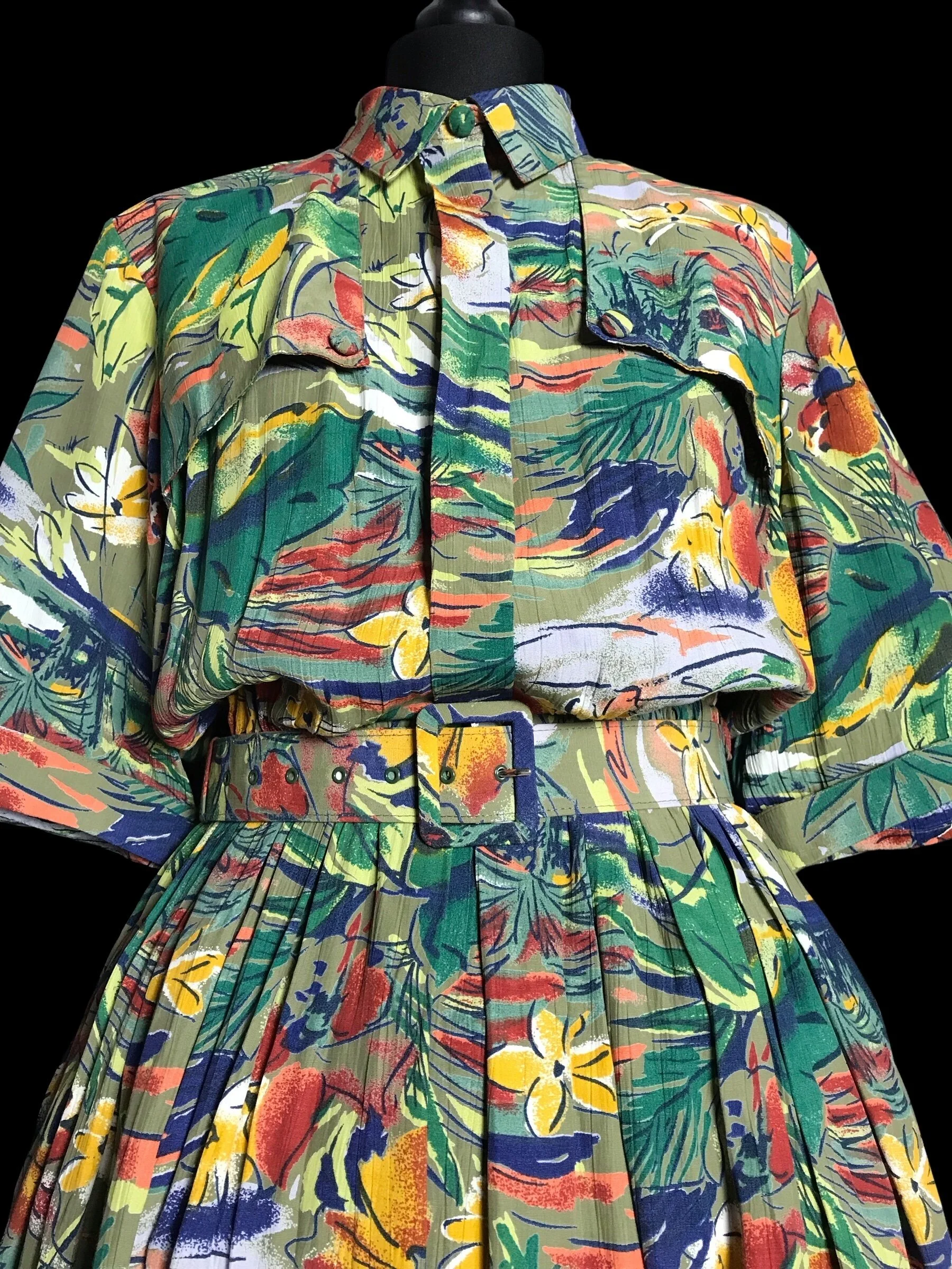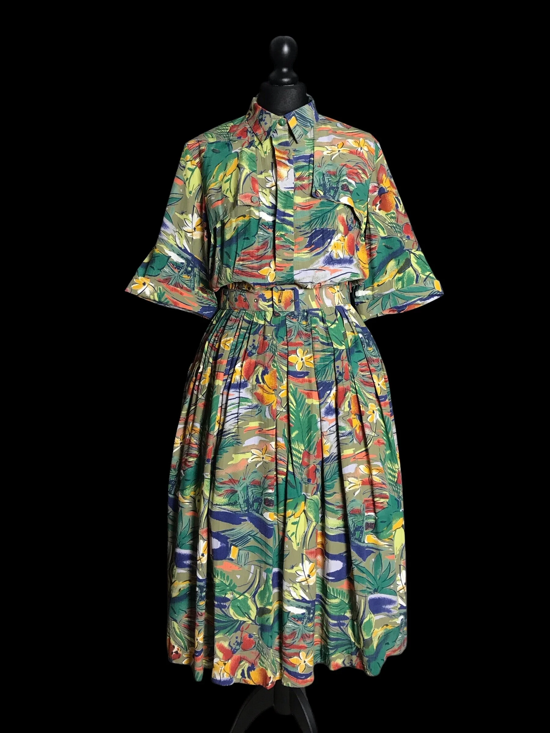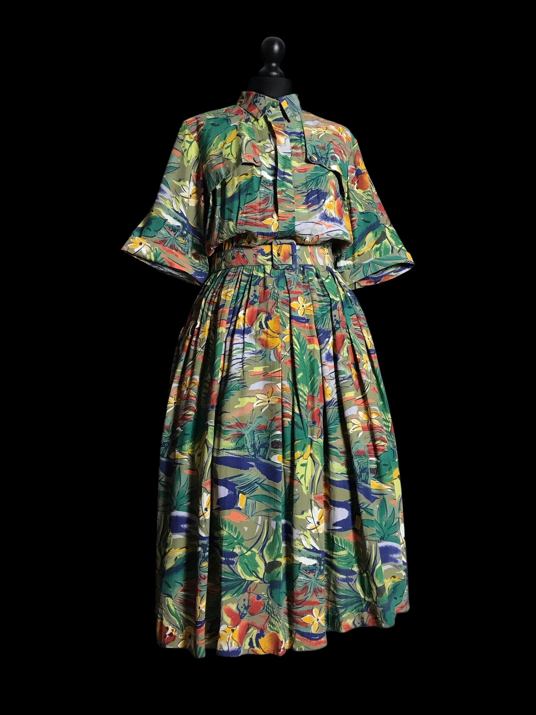 The skirt section is lightly pleated and it has 2 overlaps from the shoulder-line to just above the bust. It comes with a matching belt and has 2 hip pockets.
