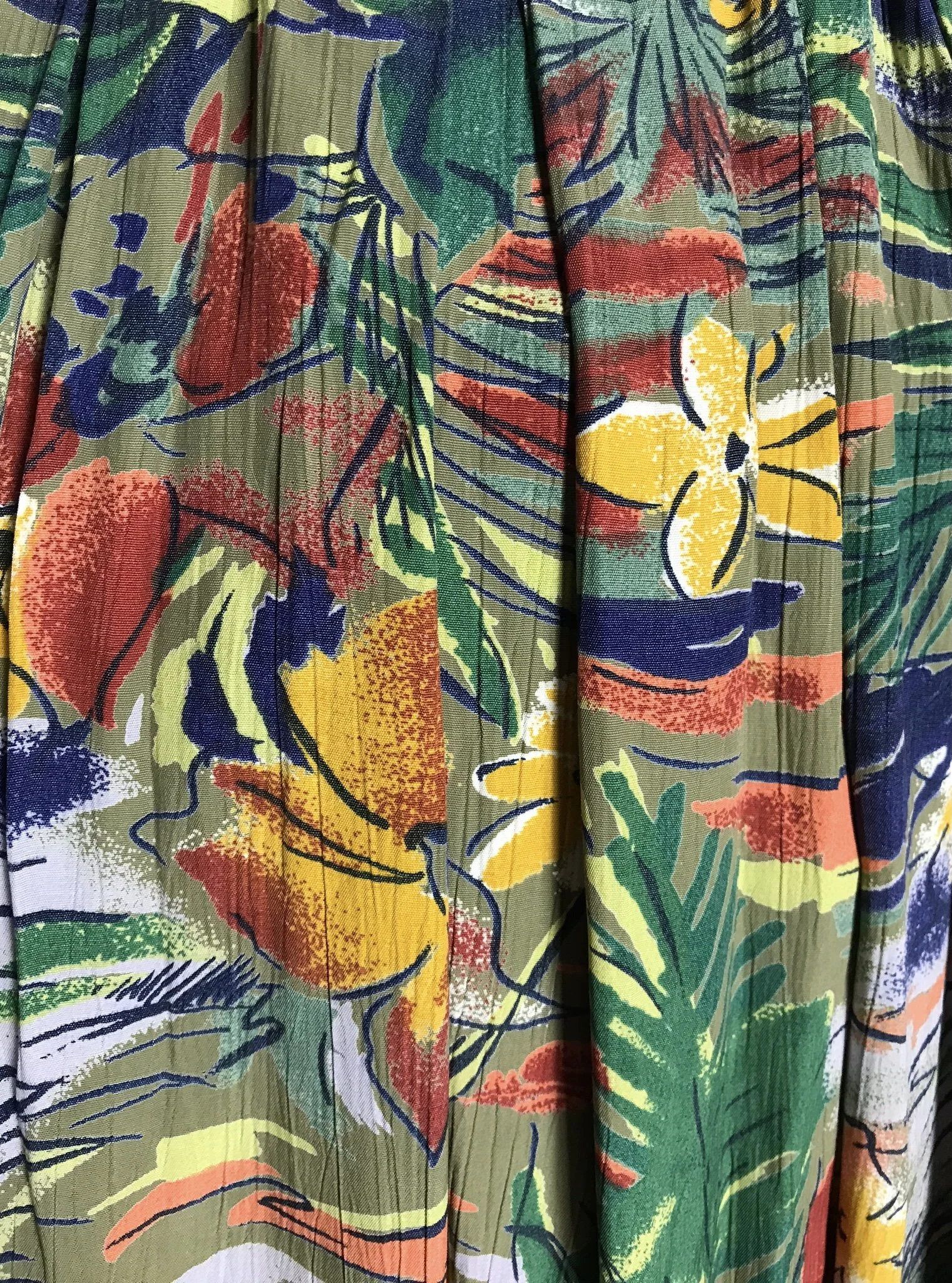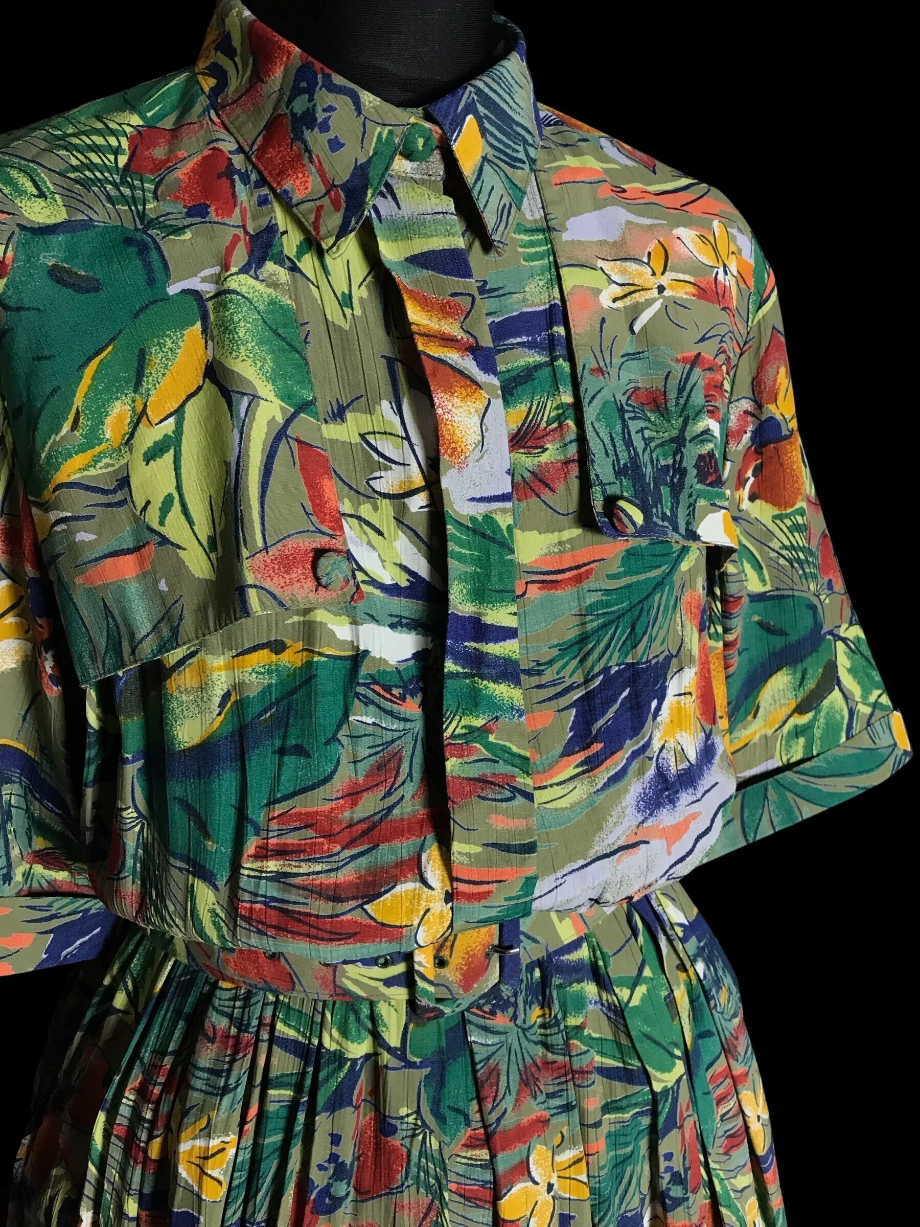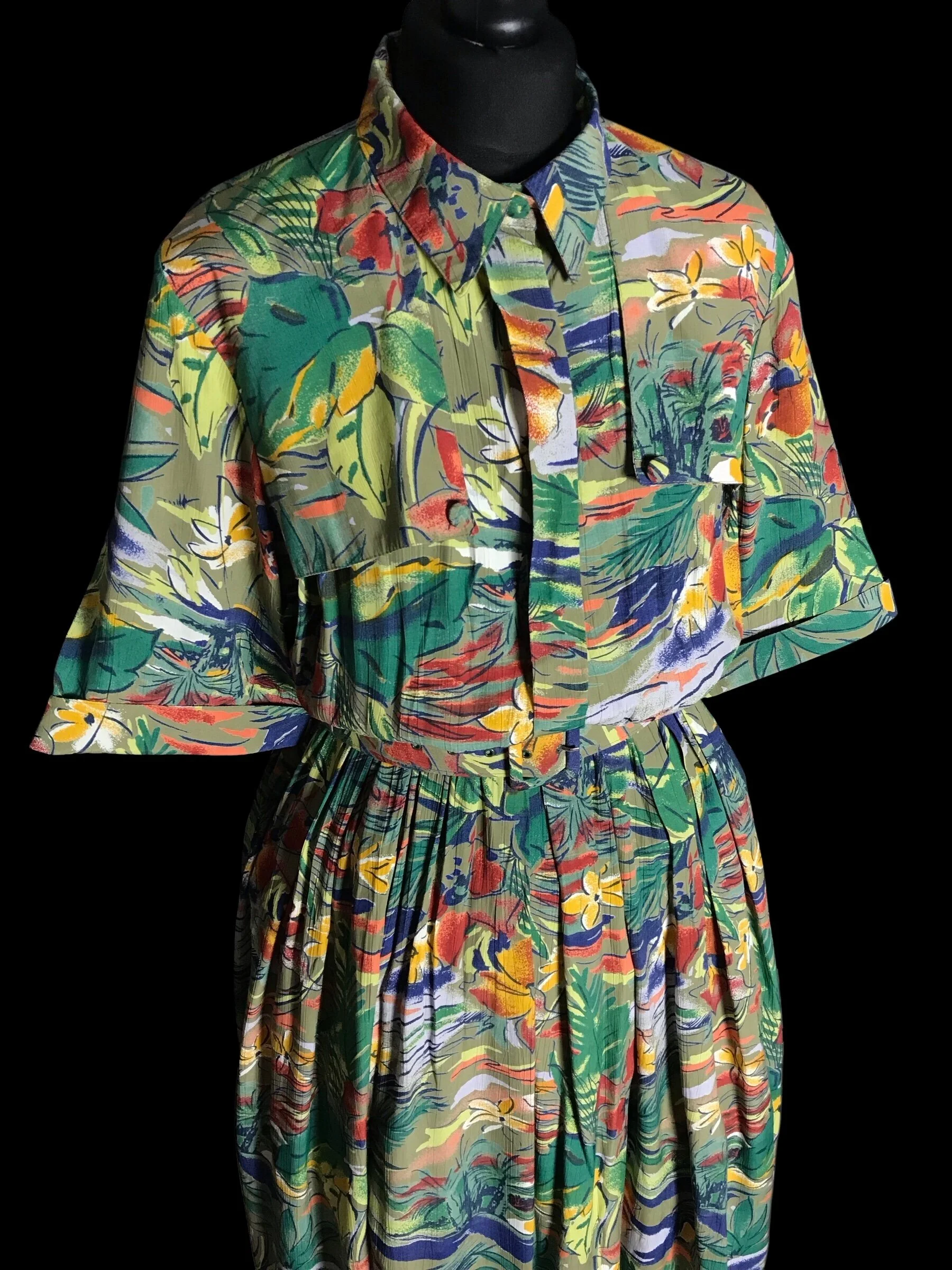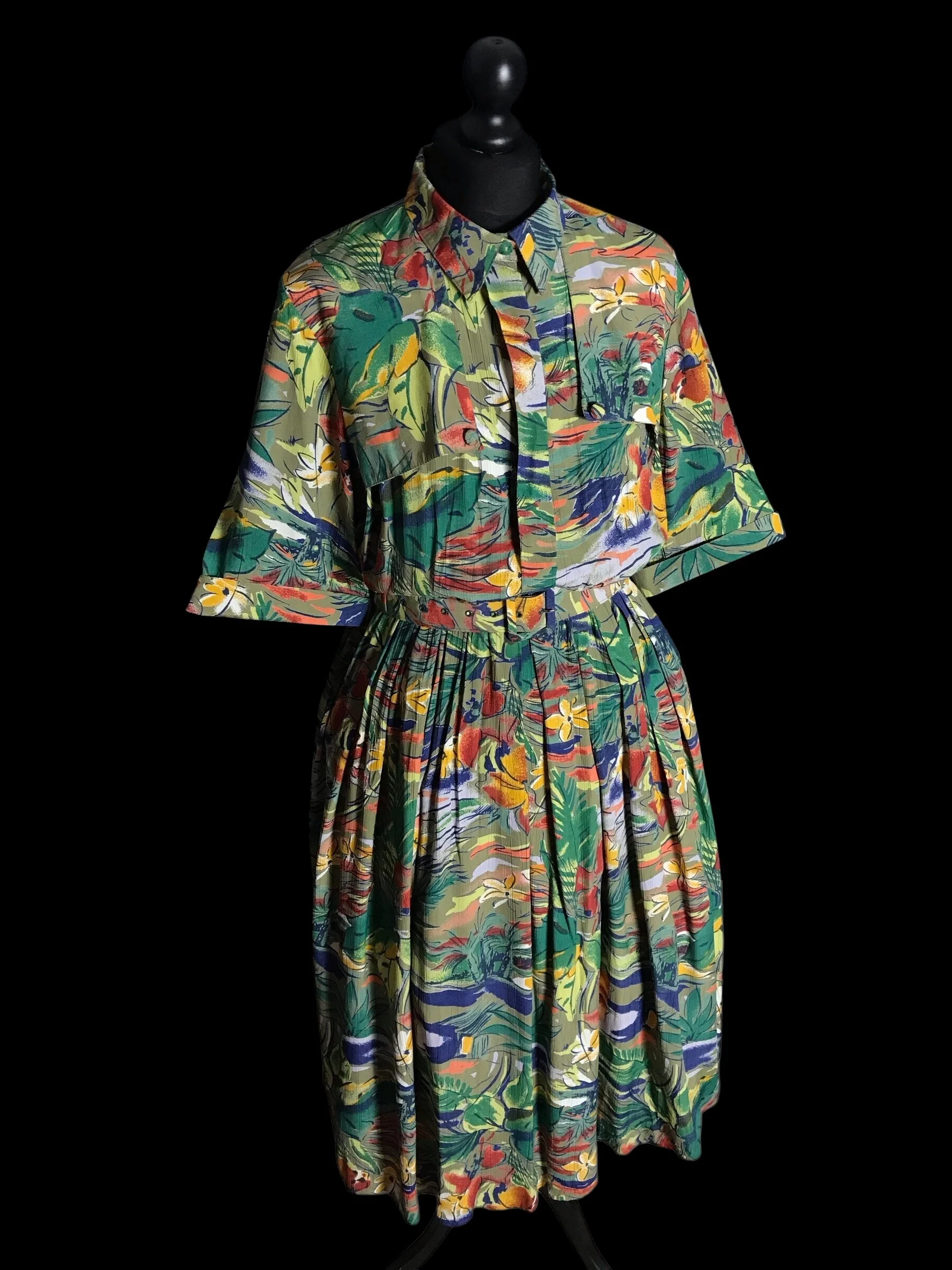 The skirt section is lightly pleated and it has 2 overlaps from the shoulder-line to just above the bust. It comes with a matching belt and has 2 hip pockets.