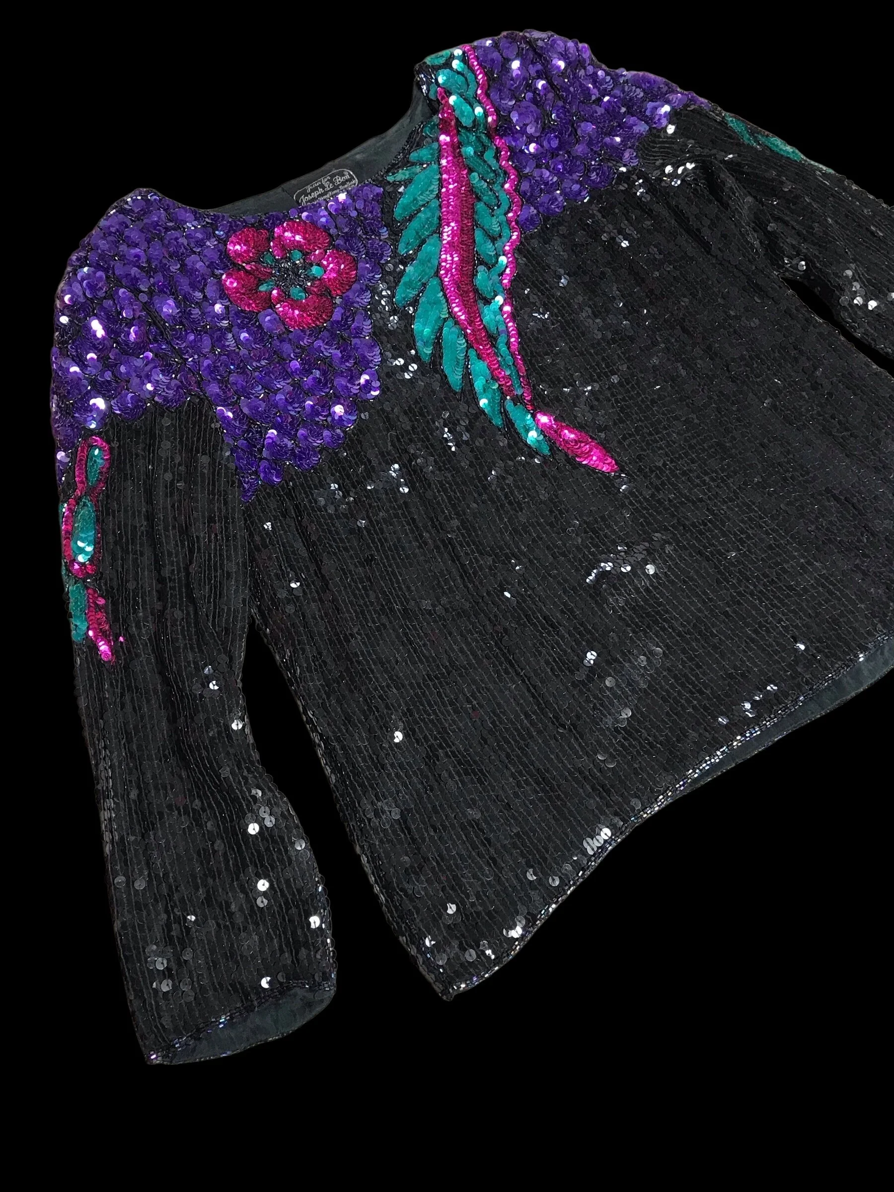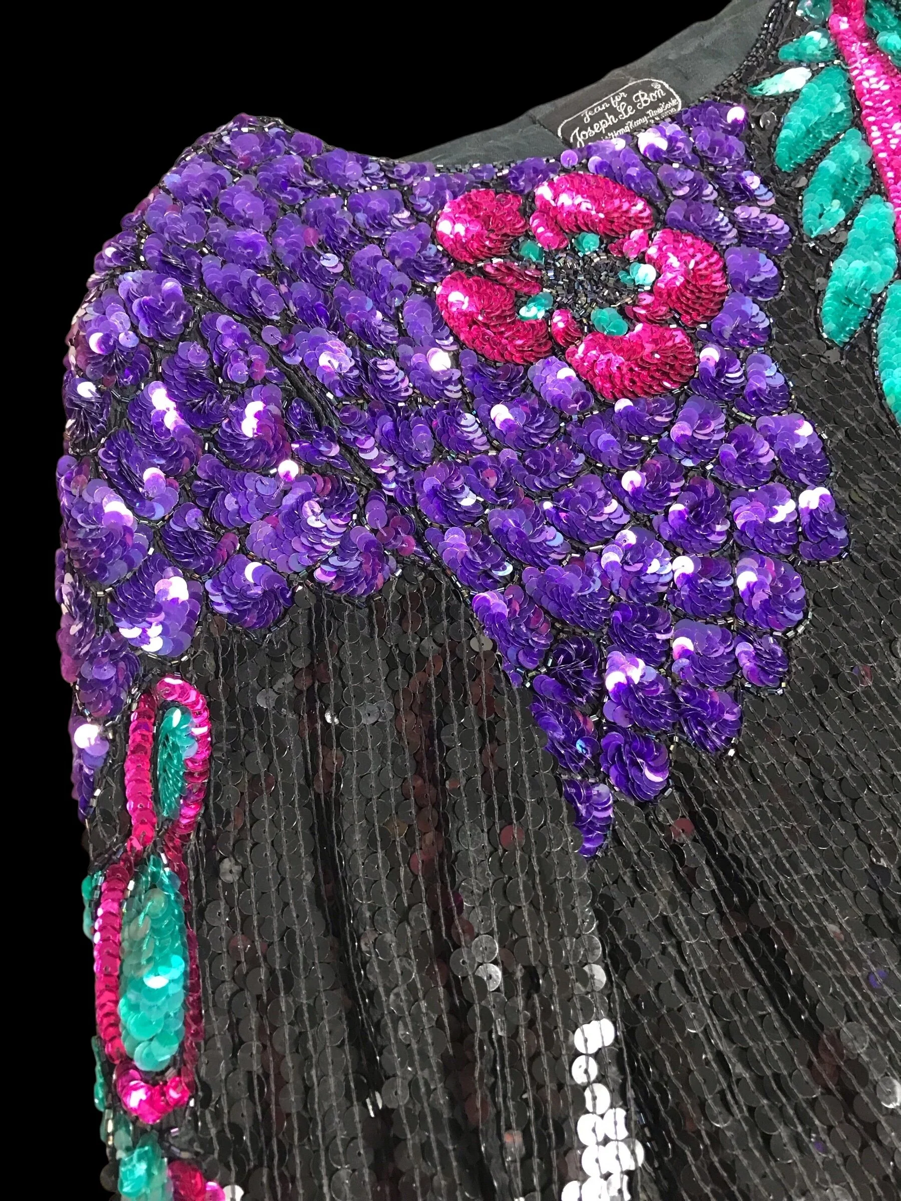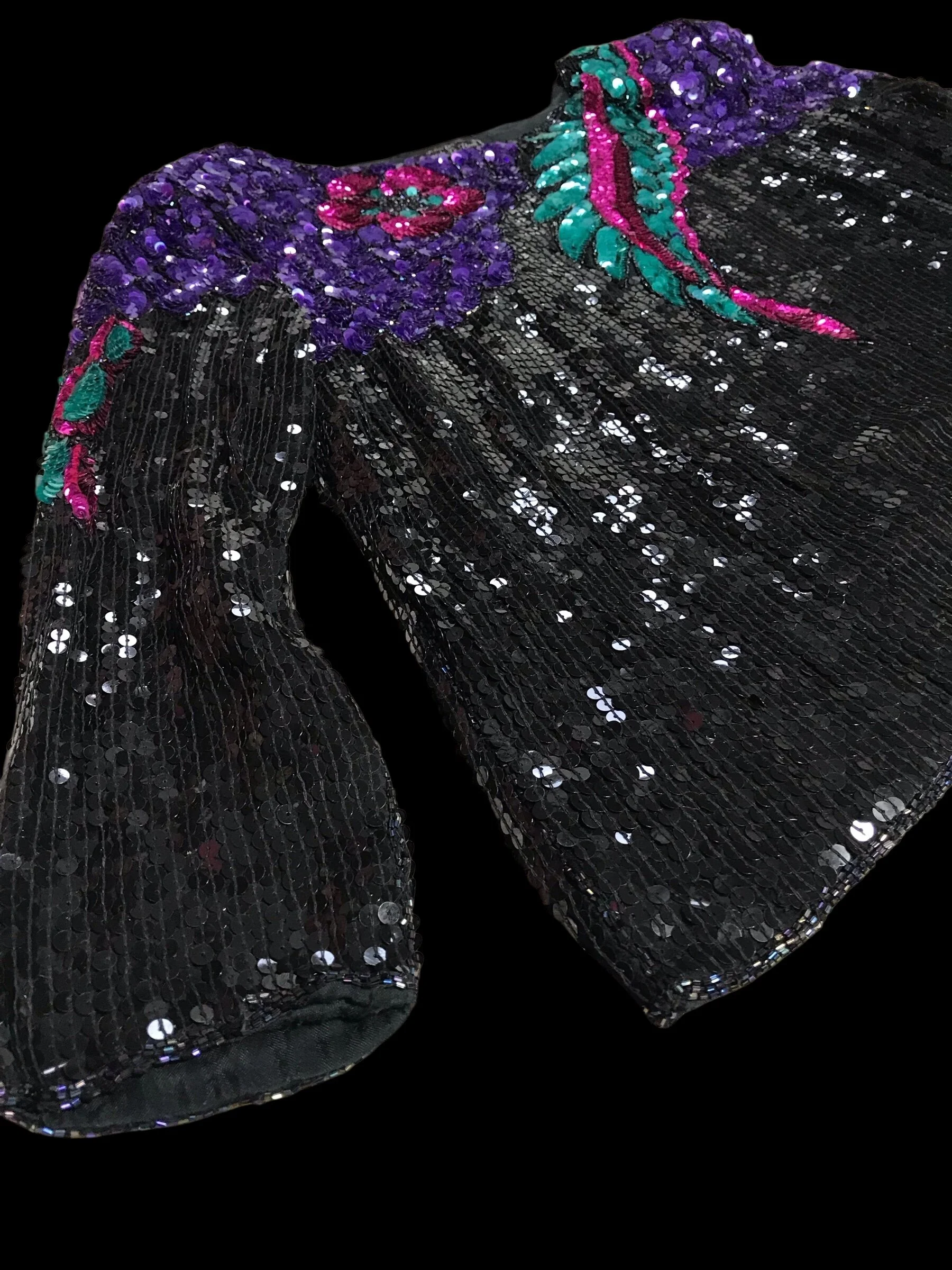 Fabulous Vintage Sequin and Silk jacket by Leslie Fay. Jacket is embellished with thousands of colourful sequins and gold bugle beads on black silk and fastens with hooks & eyes at the front. Heavy in weight and impeccable quality.