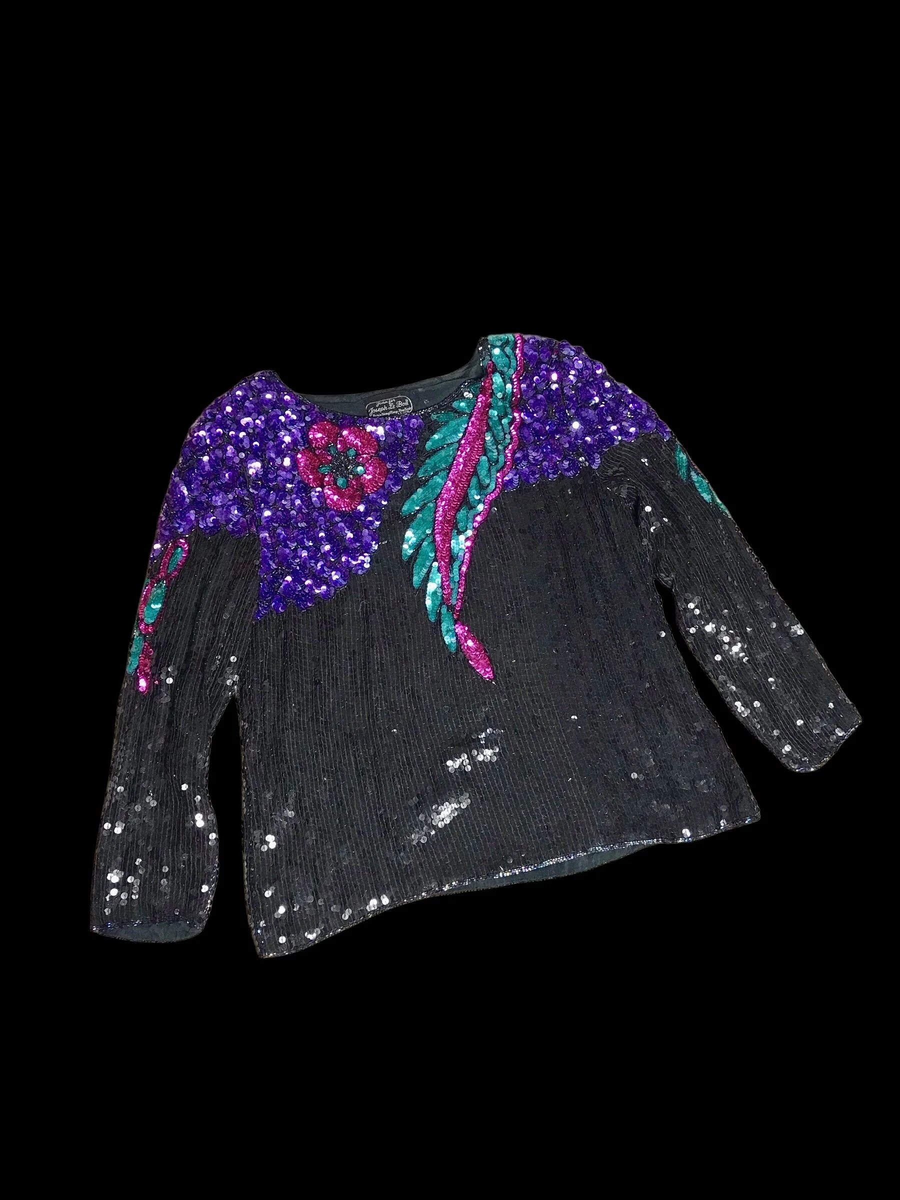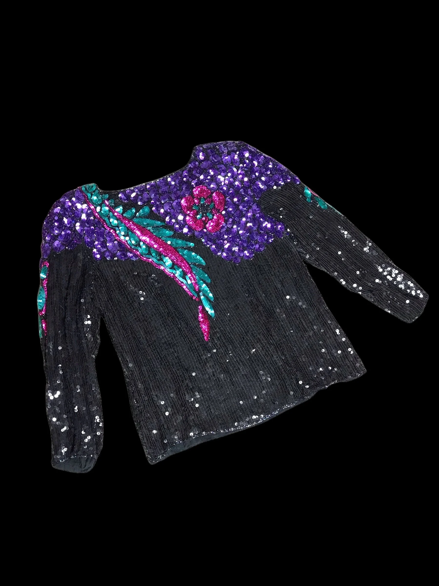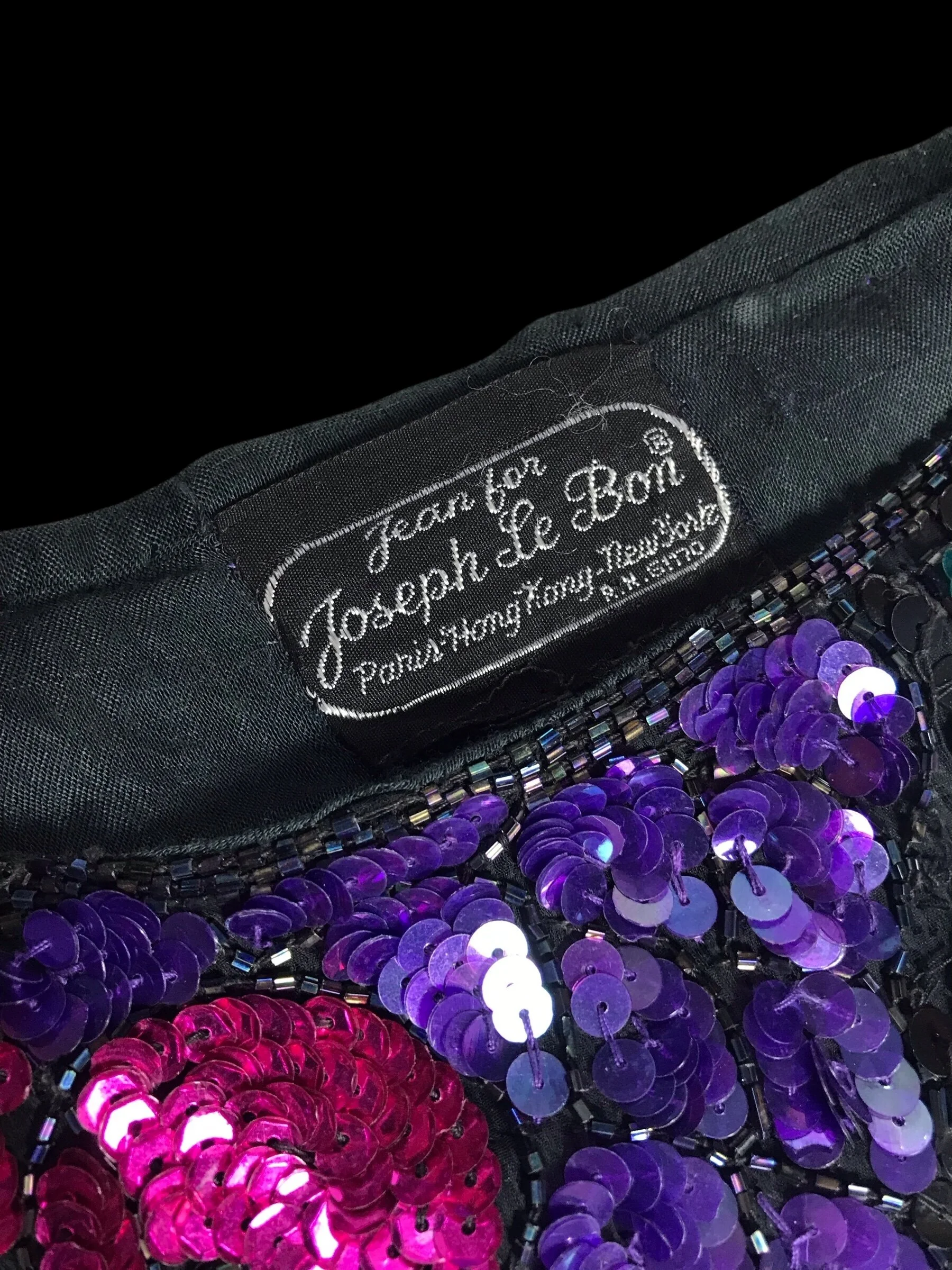 Fabulous Vintage Sequin and Silk jacket by Leslie Fay. Jacket is embellished with thousands of colourful sequins and gold bugle beads on black silk and fastens with hooks & eyes at the front. Heavy in weight and impeccable quality.