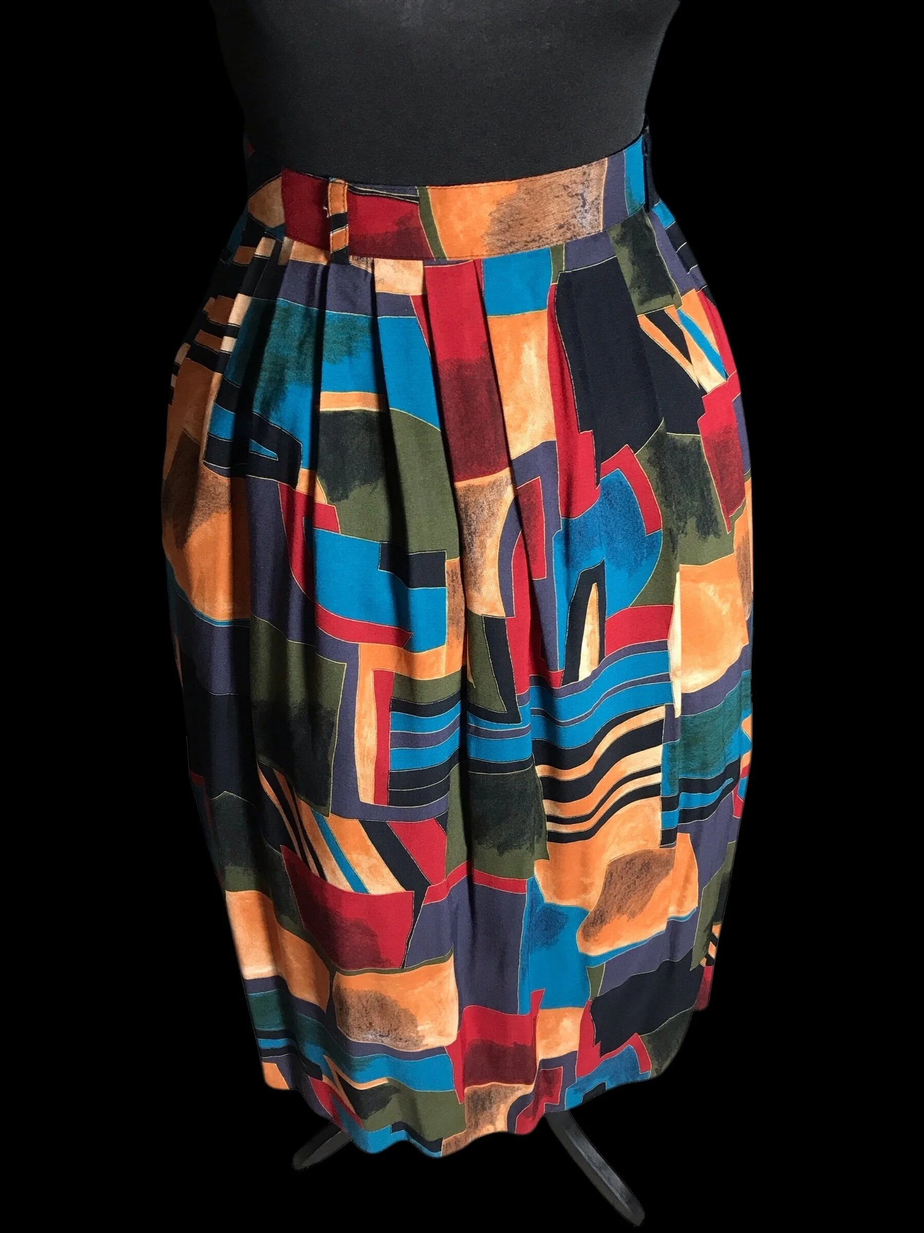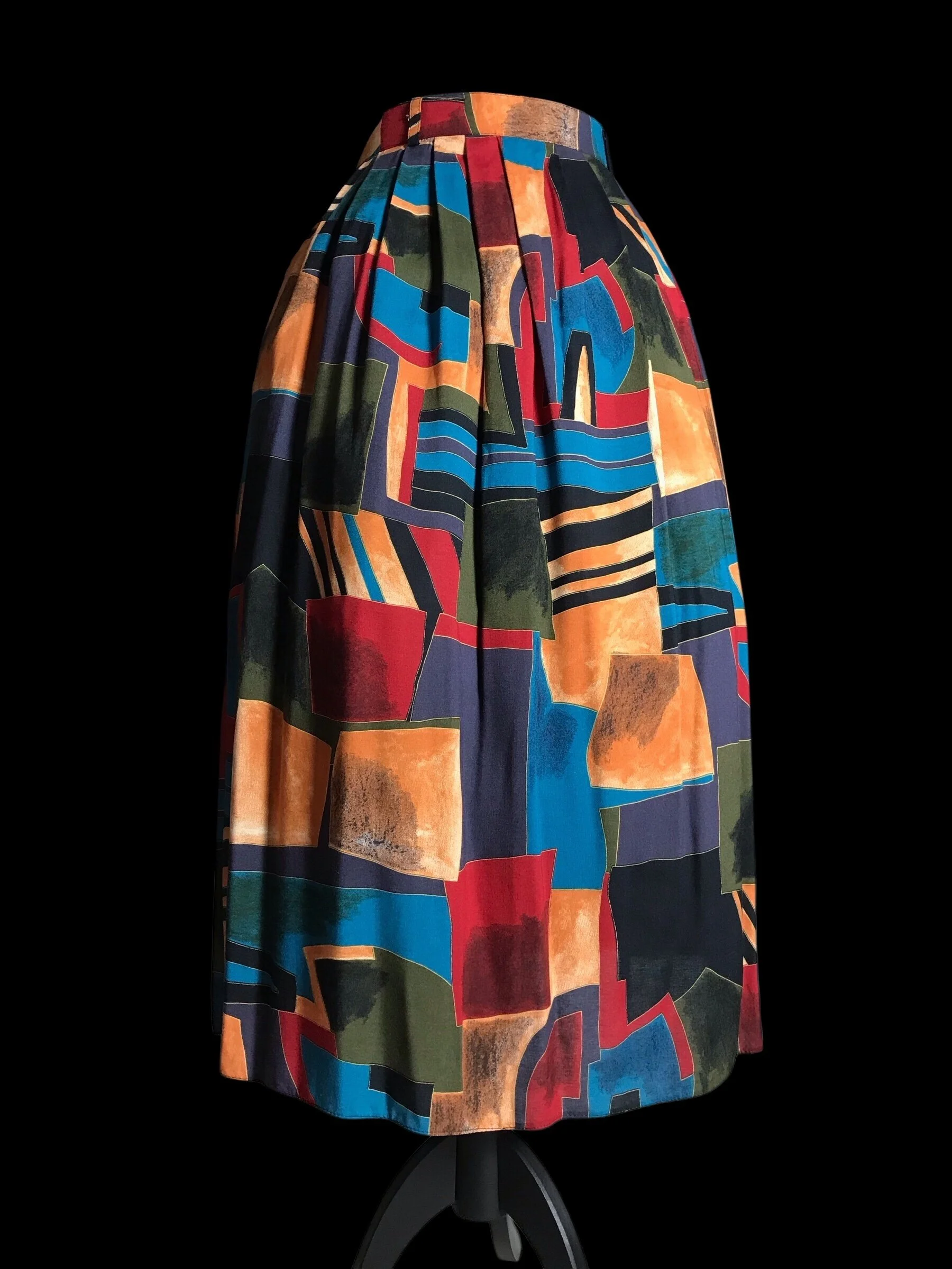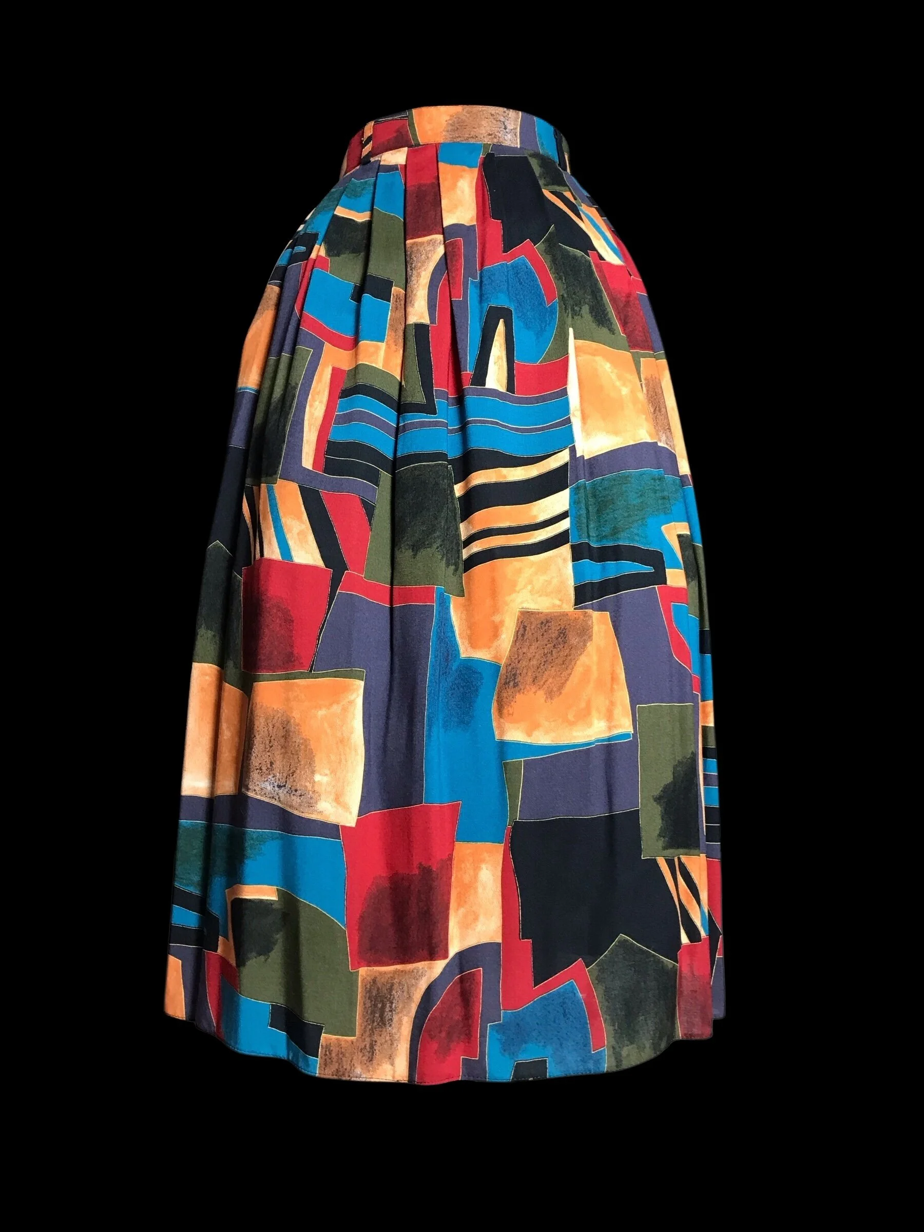 This beautiful skirt from The Sixth Sense has an eye-catching mixed abstract art pattern in bold shades of red, green, yellow, purple, black and white.