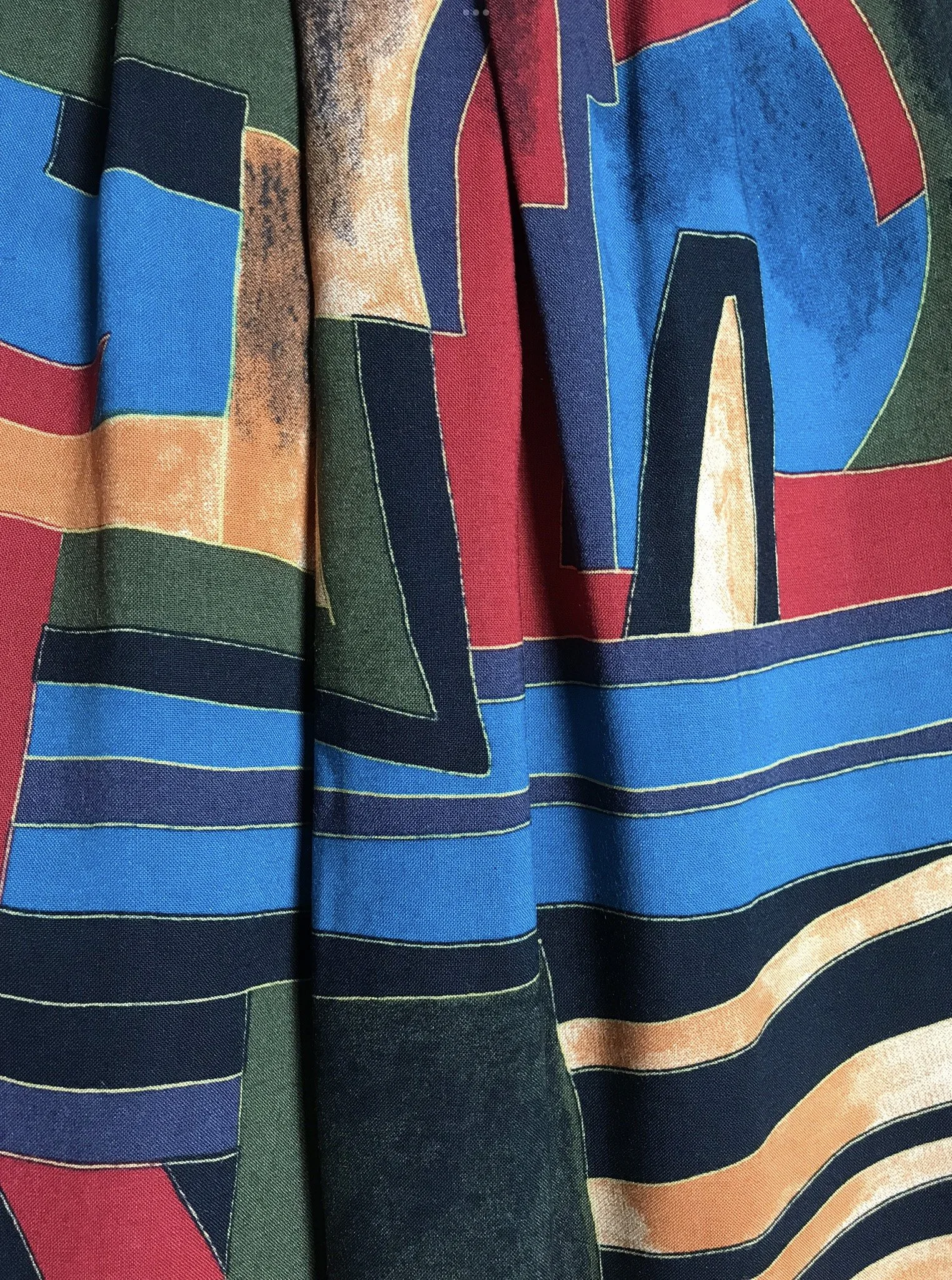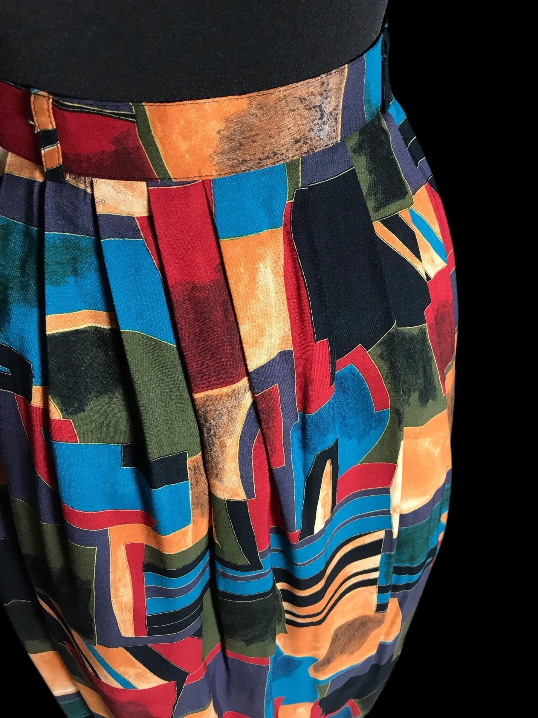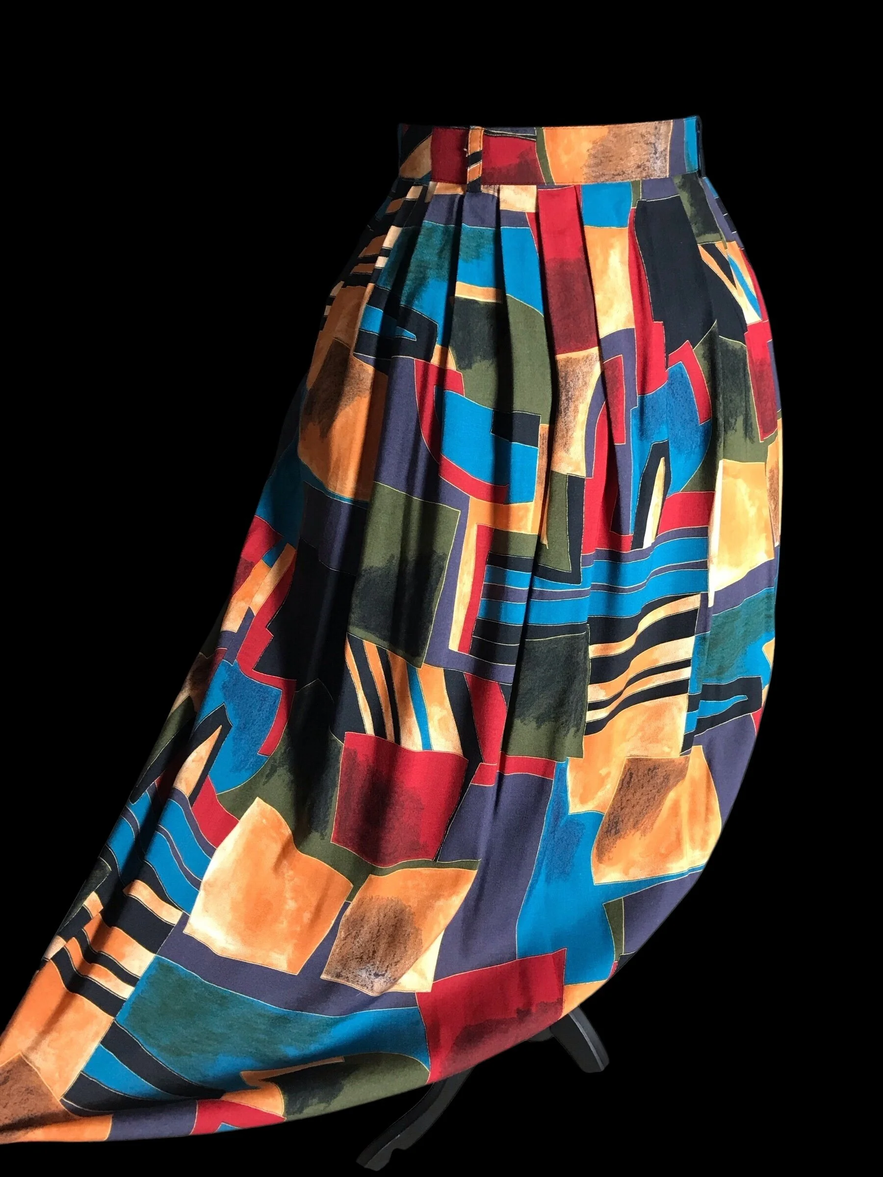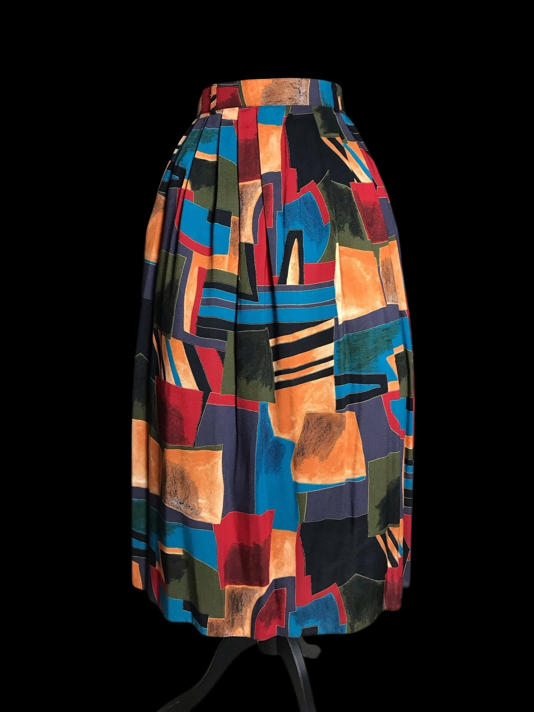 This beautiful skirt from The Sixth Sense has an eye-catching mixed abstract art pattern in bold shades of red, green, yellow, purple, black and white.