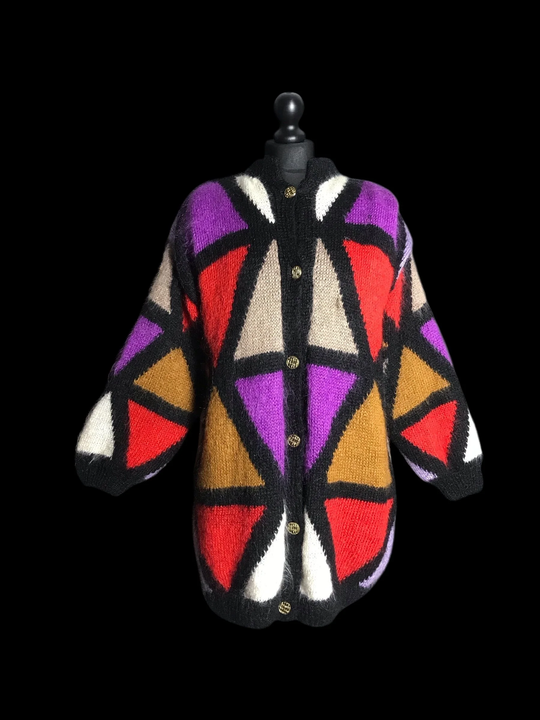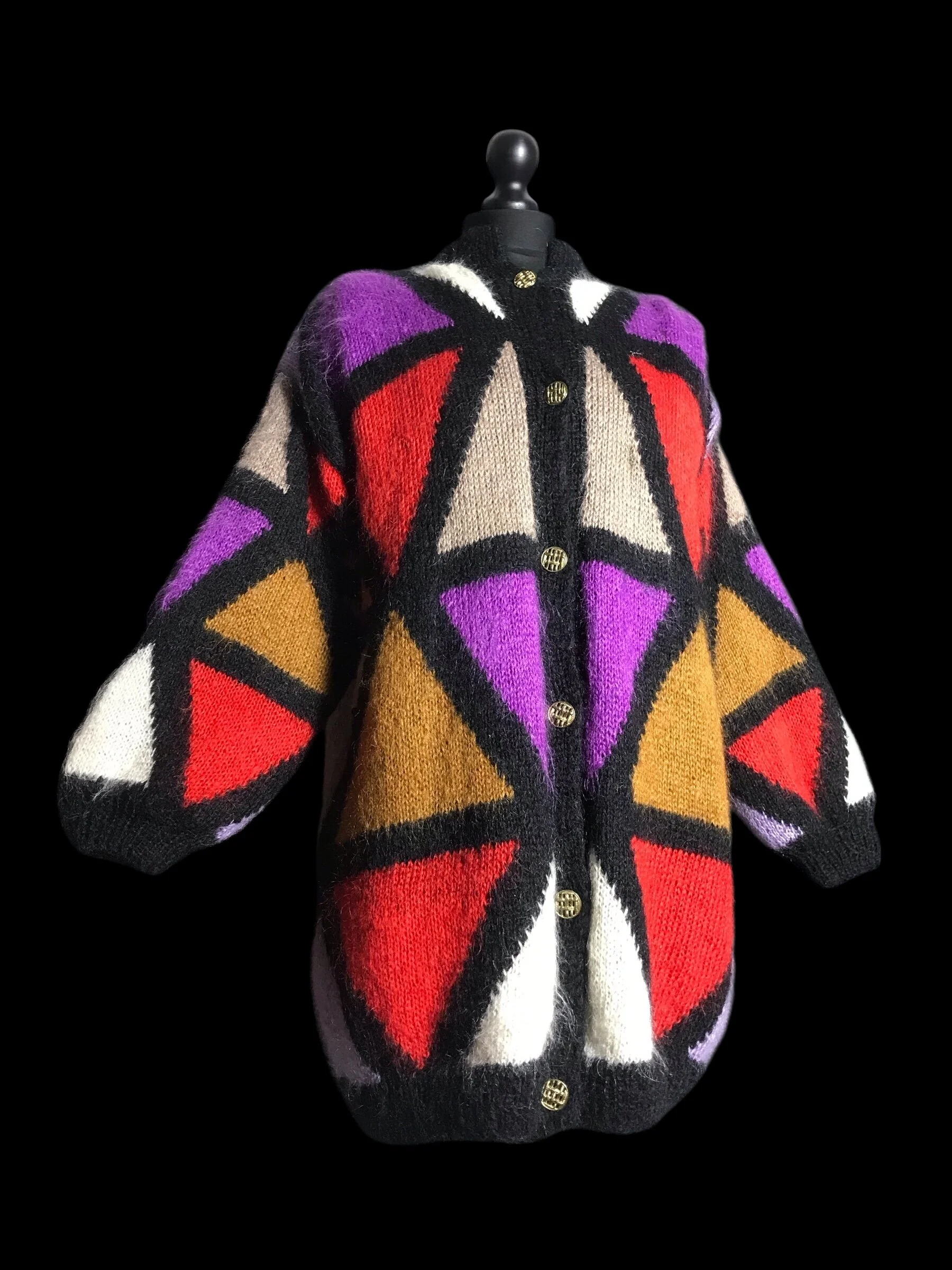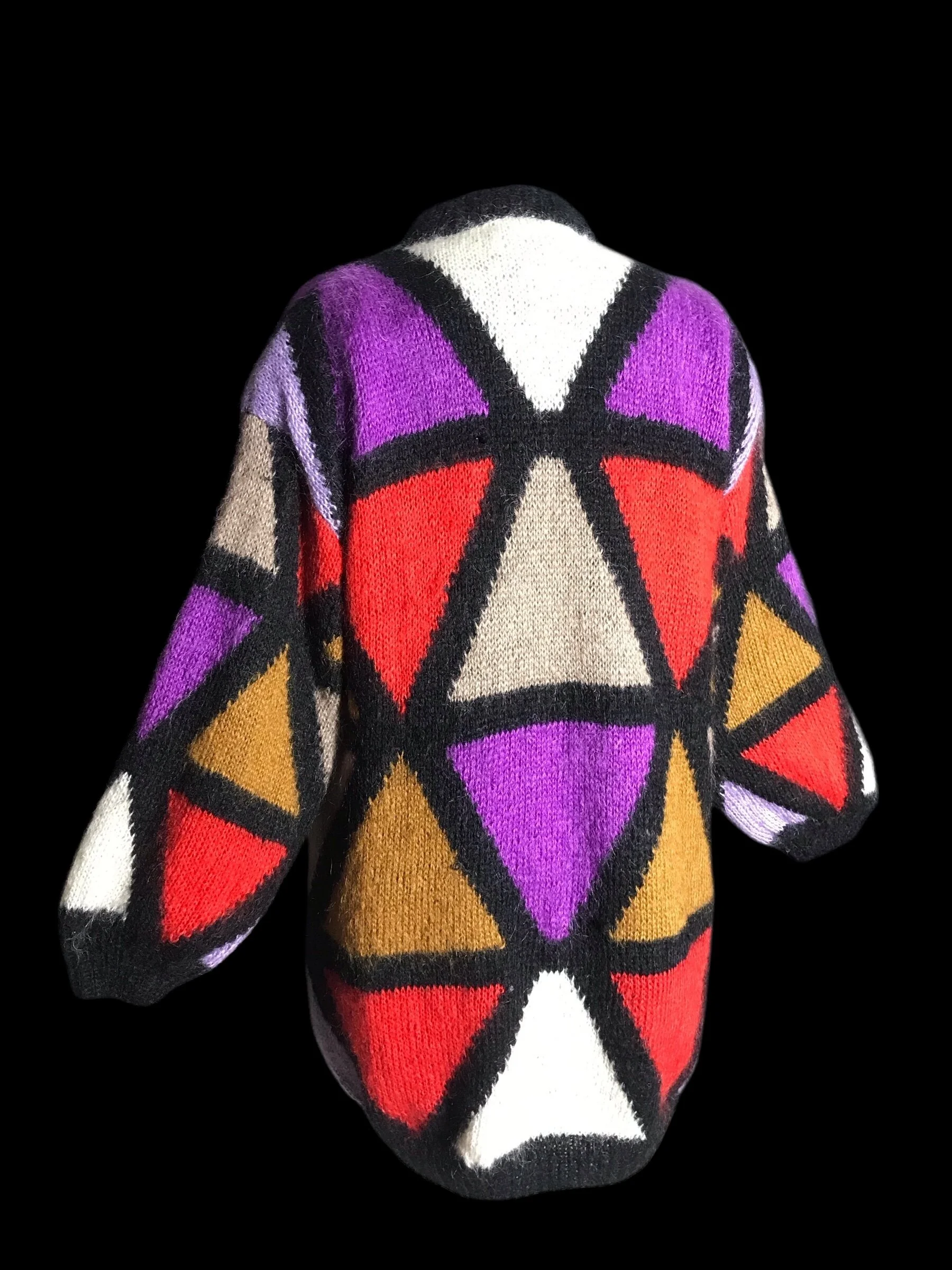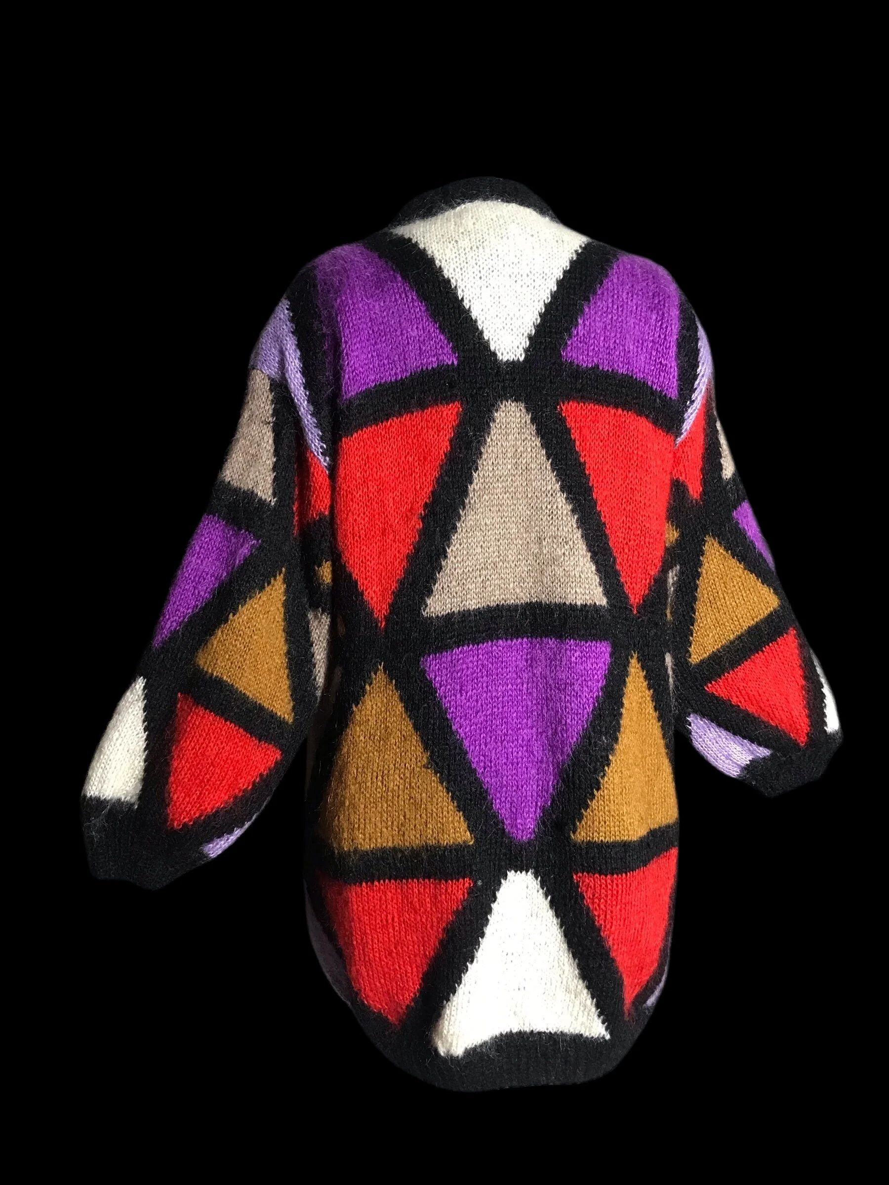 This oversized cardigan has such a colourful pattern of quads and triangles on the front and sleeves in vibrant shades of green, blues, white and black. The back is all black.