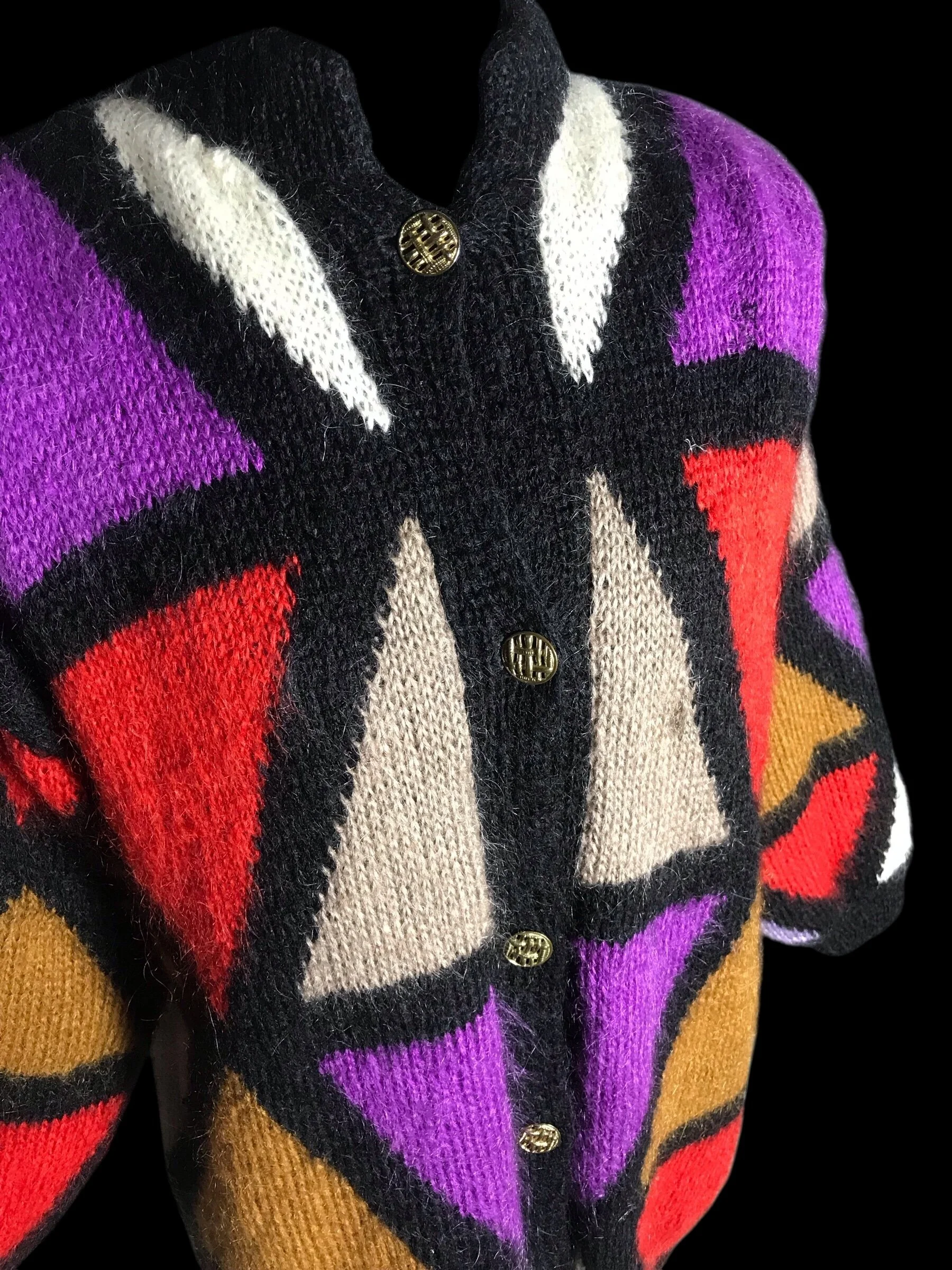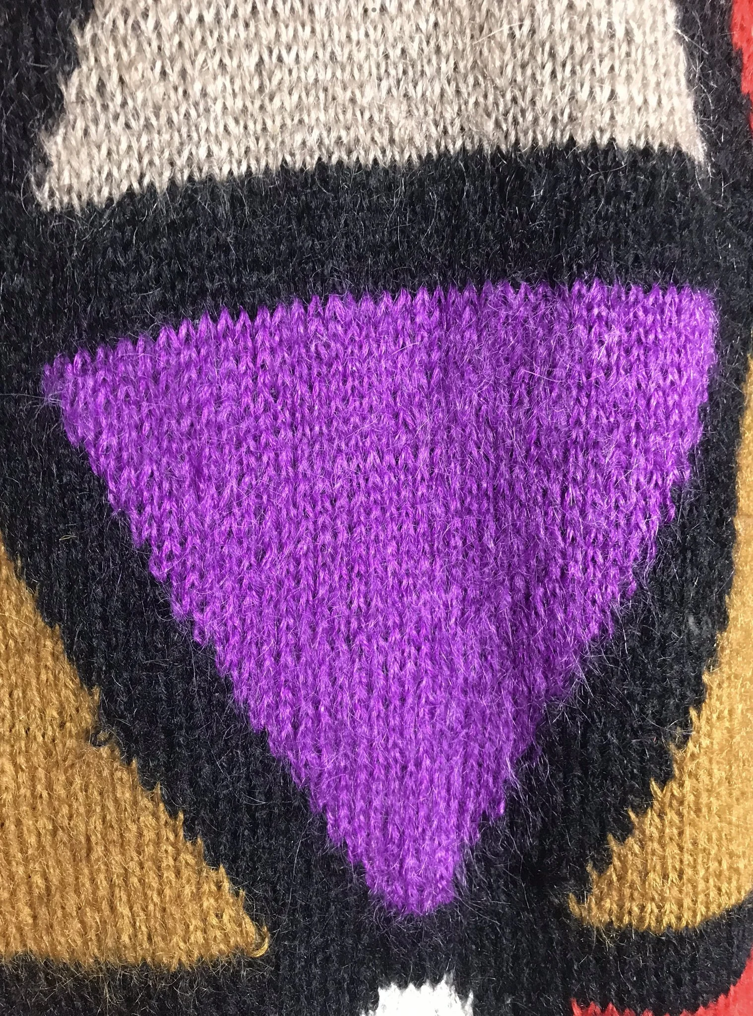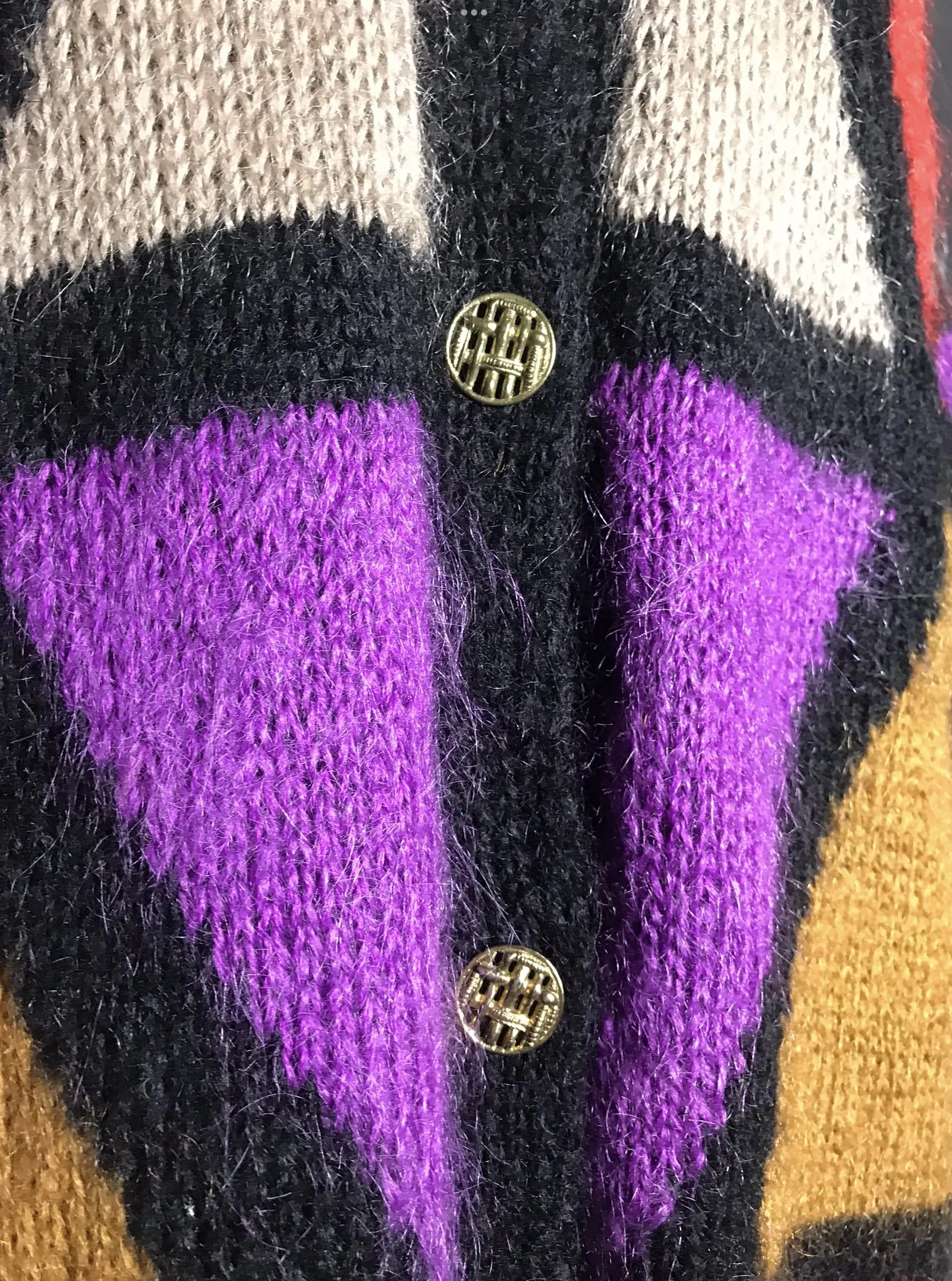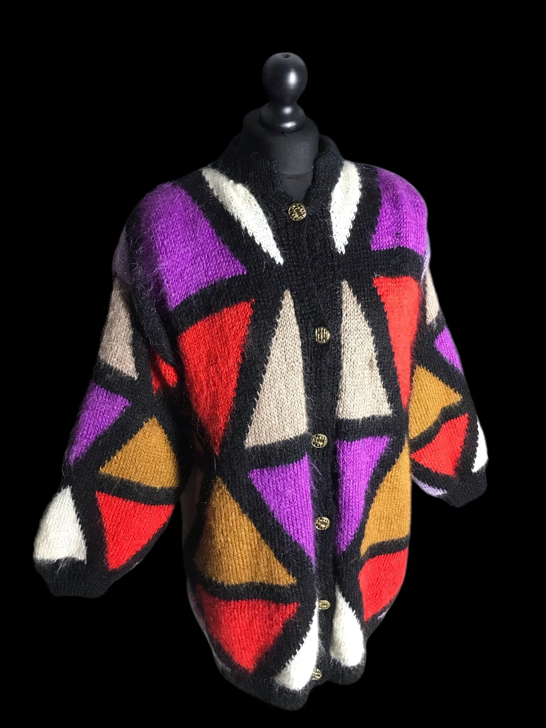 This oversized cardigan has such a colourful pattern of quads and triangles on the front and sleeves in vibrant shades of green, blues, white and black. The back is all black.